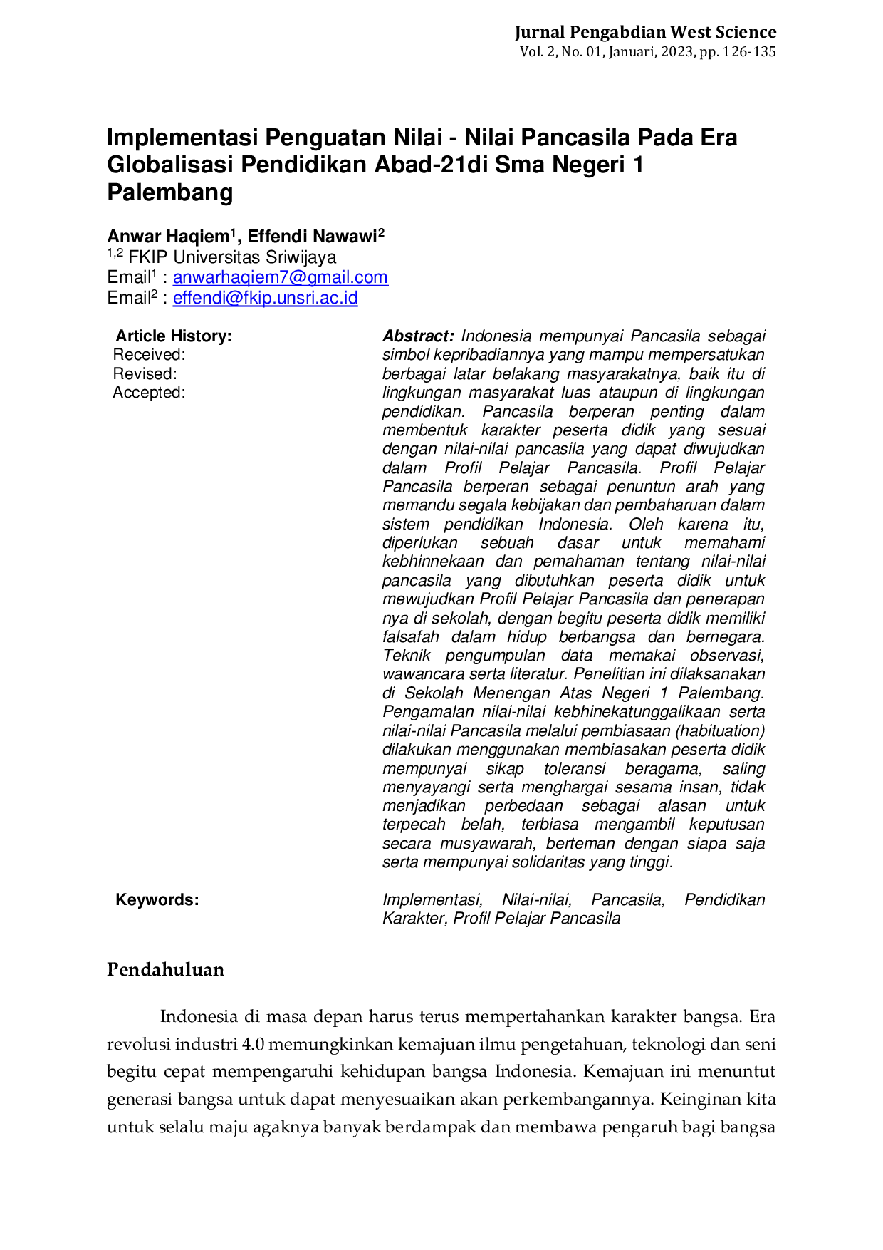 Jurnal Pengabdian West ScienceJurnal Pengabdian West ScienceIndonesia mempunyai Pancasila sebagai simbol kepribadiannya yang mampu mempersatukan berbagai latar belakang masyarakatnya, baik itu di lingkungan masyarakat luas ataupun di lingkungan pendidikan. Pancasila berperan penting dalam membentuk karakter peserta didik yang sesuai dengan nilai-nilai pancasila yang dapat diwujudkan dalam Profil Pelajar Pancasila. Profil Pelajar Pancasila berperan sebagai penuntun arah yang memandu segala kebijakan dan pembaharuan dalam sistem pendidikan itu, diperlukan untuk memahami dasar kebhinnekaan dan pemahaman tentang nilai-nilai pancasila yang dibutuhkan peserta didik untuk mewujudkan Profil Pelajar Pancasila dan penerapan nya di sekolah, dengan begitu peserta didik memiliki falsafah dalam hidup berbangsa dan bernegara. Teknik pengumpulan data memakai observasi, wawancara serta literatur. Penelitian ini dilaksanakan di Sekolah Menengan Atas Negeri 1 Palembang. Pengamalan nilai-nilai kebhinnekatunggalikaan serta nilai-nilai Pancasila melalui pembiasaan (habituation) dilakukan menggunakan membiasakan peserta didik mempunyai sikap toleransi beragama, saling menyayangi serta menghargai sesama insan, tidak menjadikan perbedaan sebagai alasan untuk terpecah belah, terbiasa mengambil keputusan secara musyawarah, berteman dengan siapa saja serta mempunyai solidaritas yang tinggi.