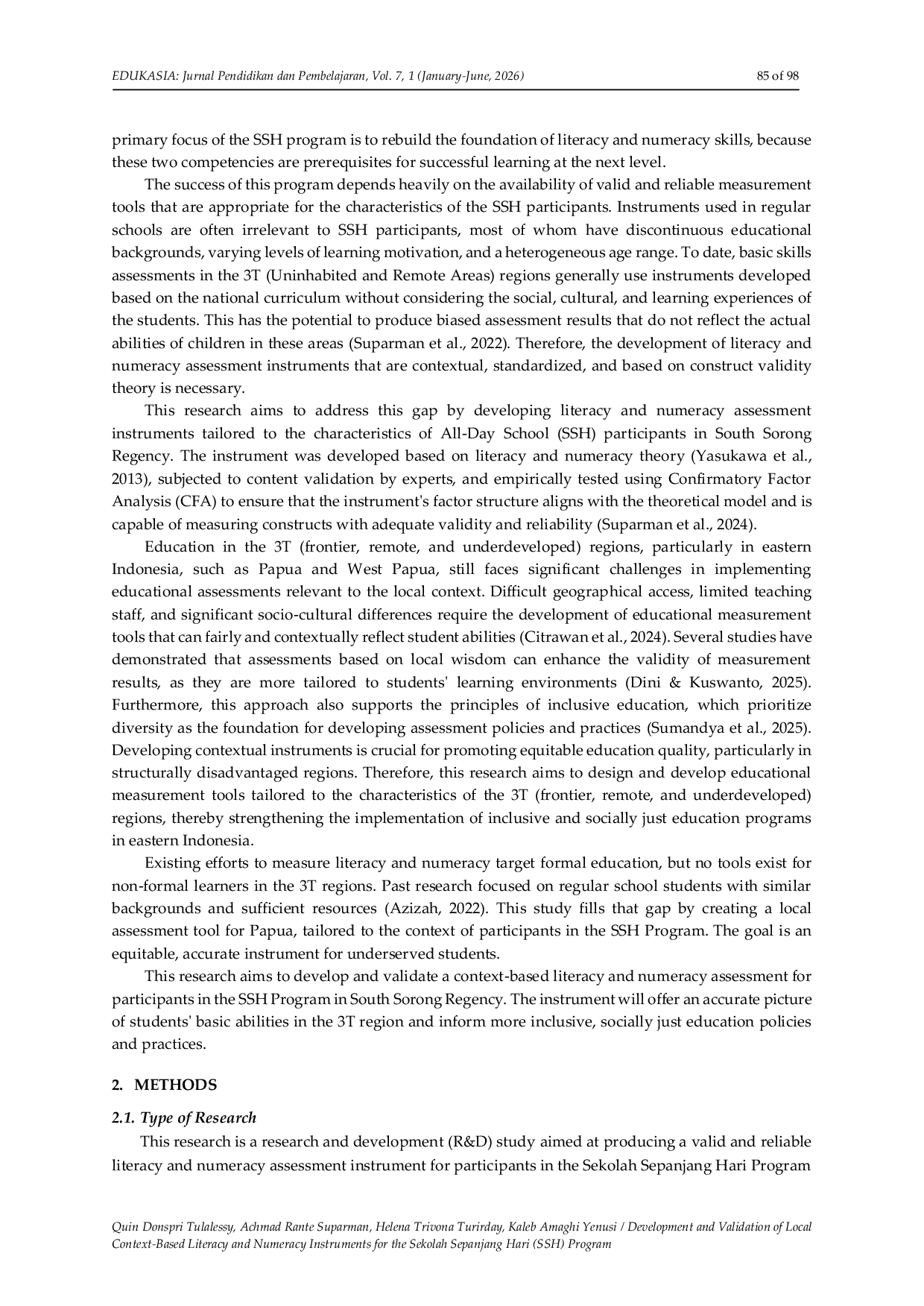 Penelitian ini berhasil mengembangkan dan memvalidasi instrumen penilaian literasi dan numerasi dasar yang berbasis konteks lokal untuk peserta Sekolah Sepanjang Hari (SSH) di Kabupaten Sorong Selatan.Instrumen ini terbukti memiliki validitas konstruk yang kuat, konsistensi teoritis yang tinggi, dan kesesuaian empiris yang baik, sehingga cocok digunakan sebagai alat pengukuran diagnostik dalam konteks pendidikan non-formal di Indonesia.Pendekatan berbasis konteks meningkatkan validitas, keadilan pengukuran, dan partisipasi siswa dalam proses penilaian.Instrumen ini tidak hanya berfungsi sebagai alat pengukuran akademik, tetapi juga sebagai alat diagnostik yang membantu pendidik memetakan kemampuan dasar peserta dan merancang intervensi pembelajaran adaptif sesuai kebutuhan mereka.Penelitian ini memperkuat pandangan bahwa literasi dan numerasi adalah kompetensi multidimensi yang saling terhubung dan menjadi fondasi belajar seumur hidup.