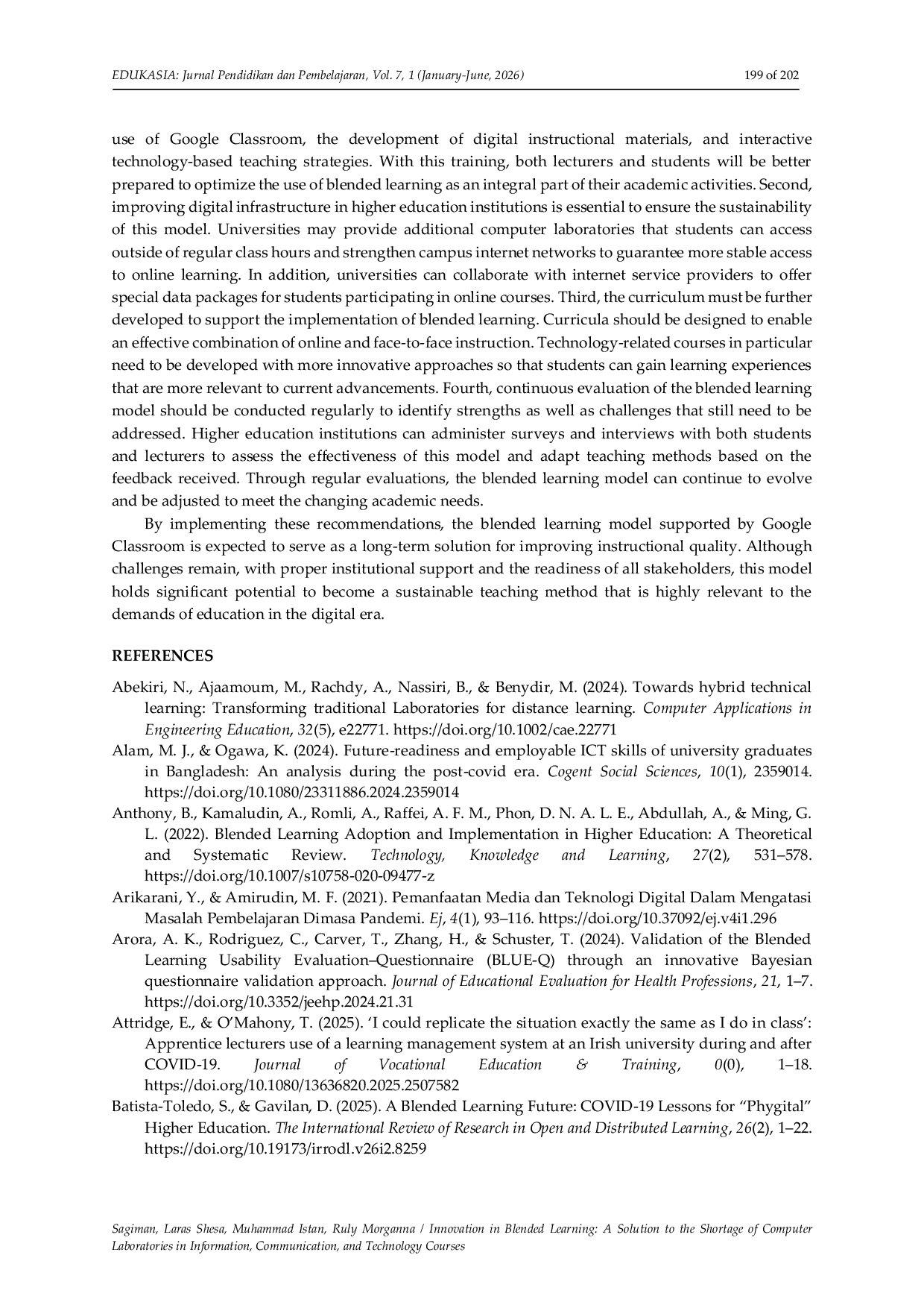 Temuan penelitian menunjukkan bahwa model pembelajaran blended yang didukung oleh Google Classroom secara signifikan meningkatkan kemandirian belajar siswa dan memperkuat efektivitas pengajaran.Model ini memungkinkan siswa untuk mengakses materi, menyelesaikan tugas, dan berinteraksi dengan dosen secara fleksibel tanpa bergantung pada ketersediaan laboratorium komputer.Melalui pembelajaran blended, siswa dapat menggunakan perangkat pribadi mereka untuk mempelajari konsep-konsep penting, sementara sesi tatap muka lebih difokuskan pada diskusi, pemecahan masalah, dan bimbingan akademik mendalam.Selain itu, penggunaan Google Classroom memudahkan distribusi materi, pengumpulan tugas, dan evaluasi hasil belajar secara efisien.Implementasi model ini terbukti meningkatkan kemandirian belajar siswa, memperkuat efektivitas pengajaran, dan mengoptimalkan penggunaan sumber daya yang tersedia di institusi pendidikan tinggi.Meskipun masih ada tantangan dalam implementasinya, seperti kesiapan siswa dan dosen dalam mengadopsi teknologi, temuan penelitian menunjukkan bahwa dengan pelatihan yang tepat dan adaptasi, pembelajaran blended dapat menjadi metode pengajaran inovatif, efektif, dan berkelanjutan untuk meningkatkan kualitas pendidikan tinggi.