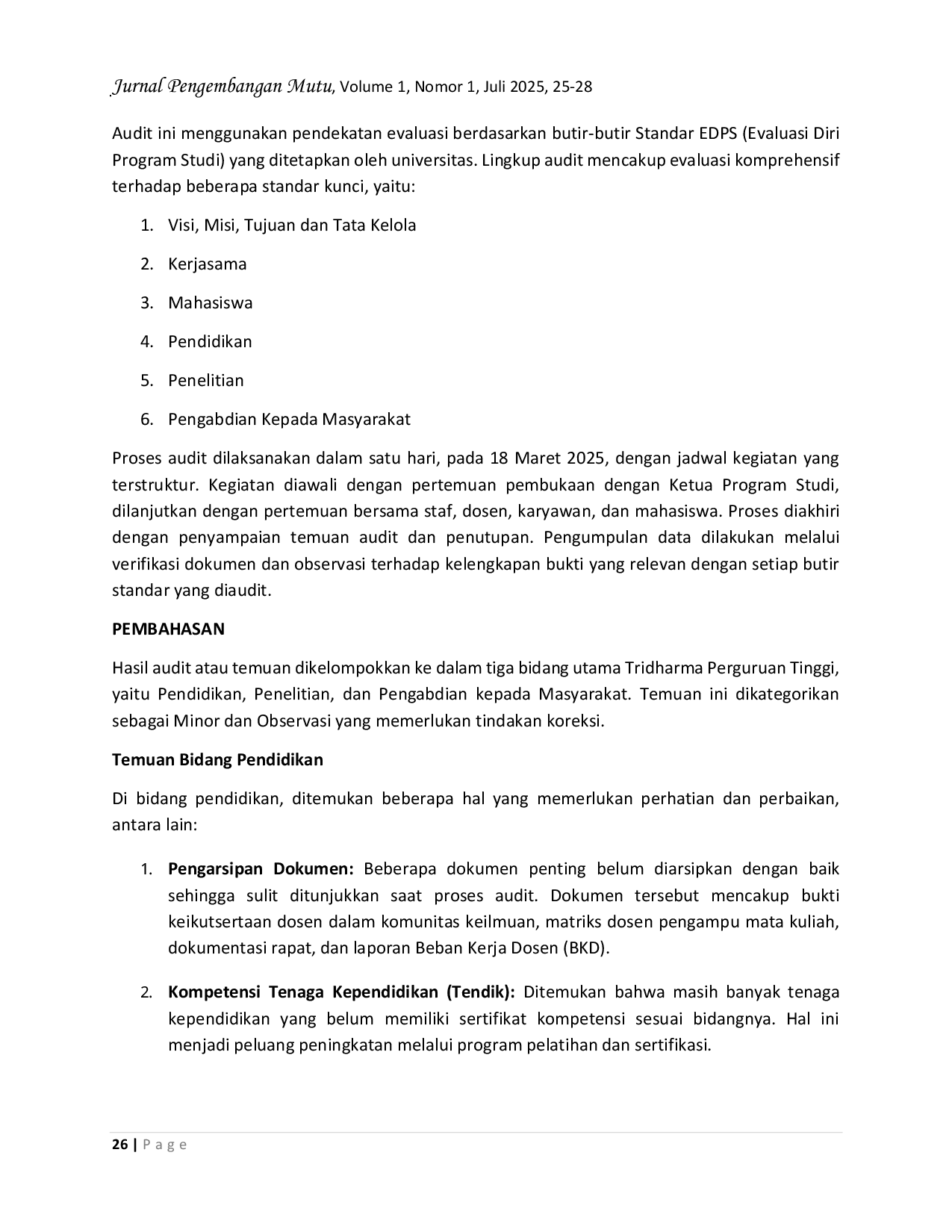 JPM : Jurnal Pengembangan MutuJPM : Jurnal Pengembangan MutuAudit Mutu Internal (AMI) ini dilaksanakan pada Program Studi S1 Akuntansi, Fakultas Ekonomi, Universitas 17 Agustus 1945 Samarinda pada 18 Maret 2025. Audit bertujuan untuk memastikan tindak lanjut temuan sebelumnya, memverifikasi kesesuaian pelaksanaan penjaminan mutu terhadap dokumen akademik, memetakan kesiapan akreditasi, dan mengidentifikasi peluang peningkatan mutu. Lingkup audit mencakup standar Visi dan Misi, Tata Kelola, Kerjasama, Mahasiswa, Pendidikan, Penelitian, dan Pengabdian Kepada Masyarakat. Hasil audit menunjukkan beberapa area yang memerlukan perbaikan dengan kategori temuan minor dan observasi. Temuan utama meliputi kebutuhan pengarsipan dokumen yang lebih baik, sertifikasi kompetensi bagi tenaga kependidikan, dan pelatihan Student-Centered Learning (SCL) di bidang Pendidikan. Pada bidang Penelitian, perlu diadakan pelatihan olah data, pelaksanaan monev internal, dan penyempurnaan pedoman penelitian. Untuk Pengabdian Masyarakat, diperlukan penyusunan rencana dan anggaran kegiatan pengabdian. Temuan ini menjadi dasar rekomendasi tindakan koreksi untuk peningkatan mutu program studi.