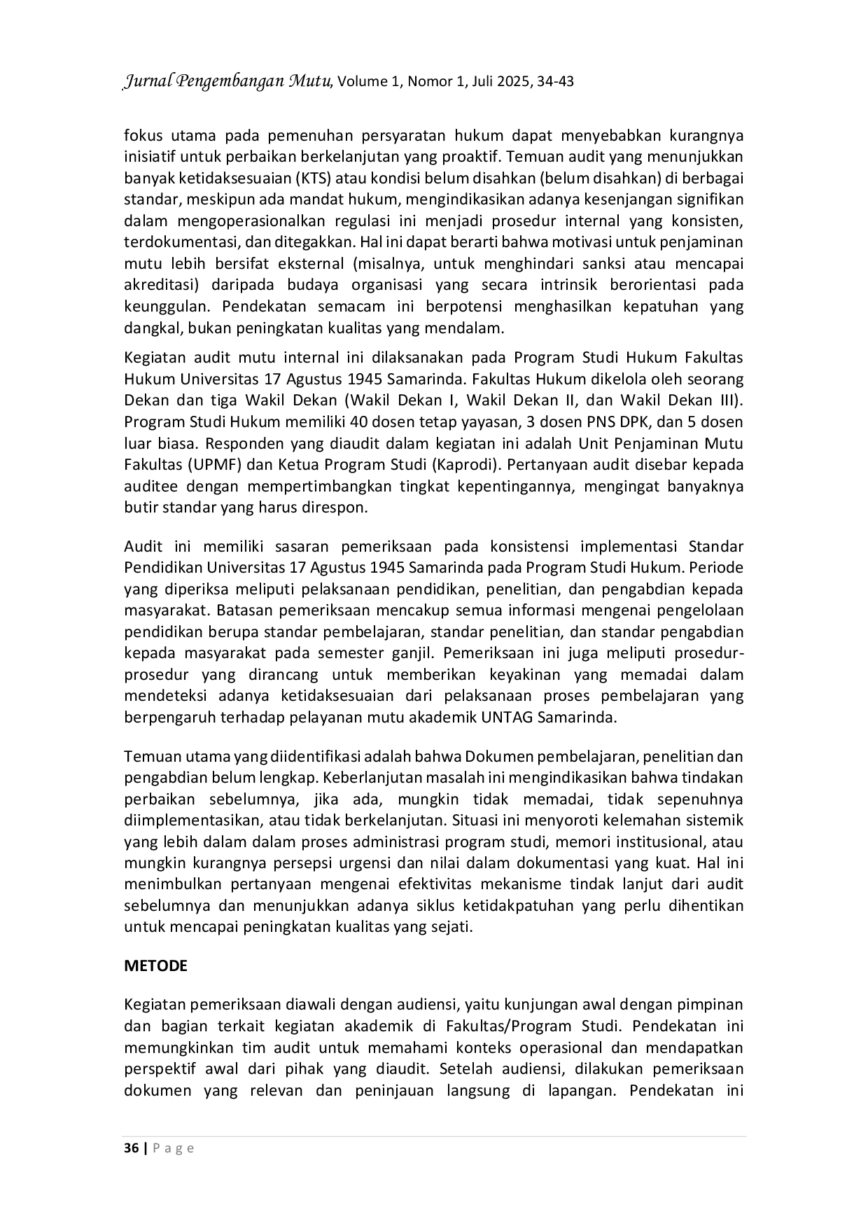 JPM : Jurnal Pengembangan MutuJPM : Jurnal Pengembangan MutuAudit Mutu Internal (AMI) pada Program Studi Hukum, Fakultas Hukum, Universitas 17 Agustus 1945 Samarinda, mengungkapkan beberapa temuan penting di bidang pendidikan, penelitian, dan pengabdian kepada masyarakat (PkM) untuk tahun akademik 2023/2024. Dalam standar pendidikan, program studi telah merumuskan standar kompetensi lulusan namun belum disahkan dan disosialisasikan. Kurikulum yang digunakan adalah kurikulum tahun 2014 yang hanya berupa daftar mata kuliah dan Rencana Pembelajaran Semester (RPS), bukan dokumen kurikulum yang komprehensif. Perencanaan perkuliahan telah dilaksanakan, namun tanpa bukti berita acara dan monitoring serta evaluasi yang komprehensif. Terkait sarana dan prasarana pembelajaran, pelaksanaannya belum optimal, tanpa Rencana Kerja dan Anggaran Tahunan (RKAT) yang jelas dan monitoring-evaluasi yang melibatkan Unit Penjaminan Mutu Fakultas (UPMF). Selain itu, program studi belum menyusun pedoman akademik sebagai acuan dan belum memiliki standar penilaian pembelajaran yang jelas. Kepemimpinan yang kuat, kebijakan dan prosedur yang formal, serta perencanaan strategis yang konsisten juga masih kurang. Pada standar penelitian, ditemukan bahwa roadmap penelitian belum diperbarui sesuai perkembangan terkini, belum semua dosen terlibat aktif dalam penelitian, dan kurangnya motivasi atau dukungan bagi dosen untuk berpartisipasi. Untuk standar pengabdian kepada masyarakat (PkM), ketiadaan roadmap PKM yang jelas dan terstruktur, serta tidak adanya pedoman formal untuk pelaksanaan dan pelaporan kegiatan PKM, menyebabkan kegiatan tidak berjalan maksimal dan kurangnya dokumentasi bukti kontribusi serta evaluasi kinerja. Secara umum, kondisi Program Studi Hukum Fakultas Hukum sudah sangat baik, namun perlu perbaikan dalam hal-hal yang masih kurang untuk dijadikan dokumen program studi. Rekomendasi utama dari AMI adalah untuk meningkatkan pengarsipan dokumen, baik hard file maupun soft file. Tindak lanjut dari hasil AMI seharusnya mencakup perbaikan, monitoring, dan evaluasi yang berkelanjutan.