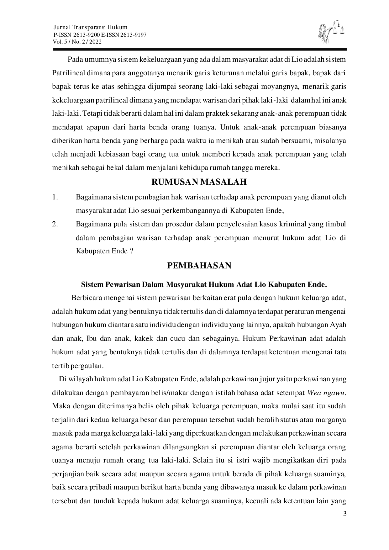 Transparansi HukumTransparansi HukumDalam sistem pembagian warisan terhadap anak perempuan yang bersifat patrilineal, memiliki keunikan yakni yang berhak mendapat warisan hanyalah anak laki-laki saja, sedangkan bagi anak perempuan tidak mendapat warisan dari orang tuannya. Hal ini menjadi problem pada saat sekarang bagi kaum perempuan, seiring dengan perkembangan zaman yang sudah mulai pudar untuk mengakui keberadaan hukum adat. Akan tetapi, aturan hukum adat ini tetap diakui oleh tokoh adat dan fungsionaris adat sampai sekarang. Oleh sebab itu dibutuhkan analisis hukum yaitu untuk membandingkan antara hukum adat dengan hukum nasional yang telah ada sehingga hukum adat dan hukum positif tidak ada kesenjangan.