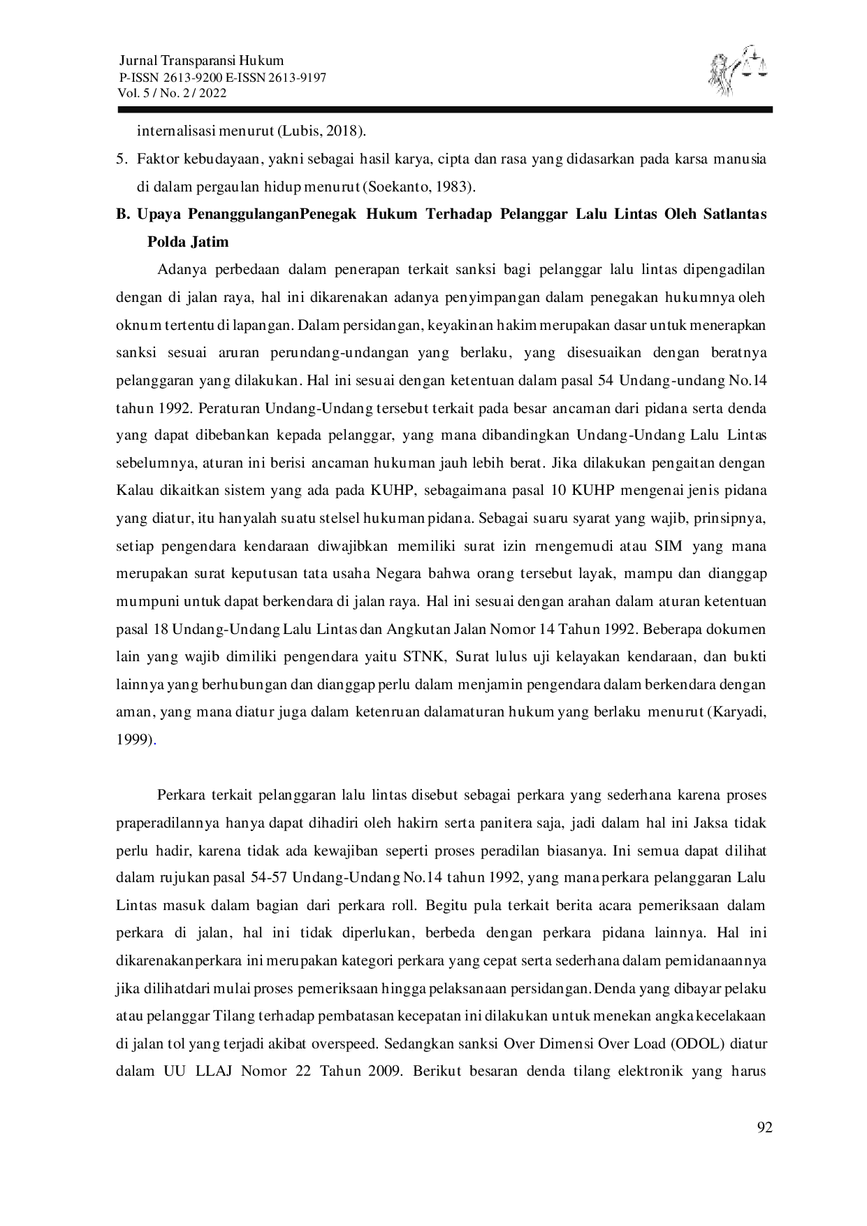 Transparansi HukumTransparansi HukumDewasa ini, pelanggaran lalu lintas adalah masalah penyebab sebagian besar terjadinya kecelakaan dan kurangnya kesadaran hukum. Undang-Undang Nomor 22 Tahun 2009 tentang Lalu Lintas dan Angkutan Jalan (UU LLAJ) merupakan aturan yang mengatur pengendara bermotor di jalan raya. Berdasarkan data perkara pelanggaran lalu lintas di Satlantas Polda Jatim Kota Surabaya pada tahun 2022, menunjukkan peningkatan perkara pelanggaran lalu lintas. Metode yuridis empiris dilakukan dengan menelaah hukum dalam kenyataan atau berdasarkan fakta yang didapat secara obyektif di lapangan, baik berupa informasi yang didasarkan pada identifikasi hukum dan efektifitas hukum. Data hasil penelitian melalui wawancara kepada Anggota Satlantas Polda Jatim menunjukkan adanya 875 kasus pelanggaran lalu lintas yang dilakukan oleh masyarakat. Upaya untuk menganggulangi pelanggaran lalu lintas adalah melakukan patroli secara berkala dan rutin, pengarahan untuk menempati posisi sesuai simpul jalan yang ditetapkan, pengaturan lalu lintas, sosialisasi, dan pemberian saran terkait kondisi jalan.