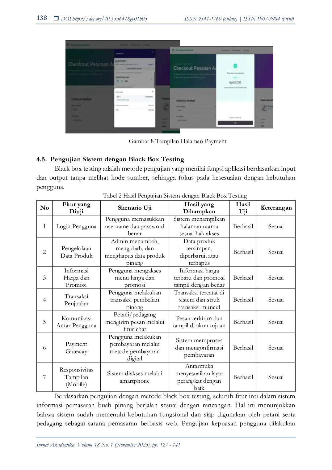 JURNAL AKADEMIKAJURNAL AKADEMIKABuah Pinang merupakan salah satu komoditas perkebunan dengan potensi ekonomi yang cukup besar, terutama sebagai produk ekspor. Namun, aktivitas pemasaran dikalangan petani dan pedagang masih menghadapi kendala, seperti keterbatasan akses informasi harga, promosi yang kurang optimal dan jaringan distribusi yang sempit. Penelitian ini bertujuan untuk merancang dan mengembangkan sistem informasi pemasaran buah pinang berbasis web yang dapat mendukung proses promosi dan transaksi. Metode pengambangan sistem yang digunakan mengacu pada model System Development Life Cycle (SDLC) yaitu waterfall, dimulai dari analisis kebutuhan pengguna, perancangan sistem, implementasi hingga tahap pengujian. Sistem ini dibuat menggunakan Bahasa pemrograman PHP dengan basis data MySQL, serta dilengkapi fitur utama berupa pengelolaan data produk, pencatatan harga, publikasi informasi dan media komunikasi antar petani dan pedagang serta fitur payment gate away. Hasil pengujian menggunakan pendekatan black box testing menunjukkan sistem dapat berfungsi sesuai dengan rancangan. Dengan adanya sistem informasi ini, diharapkan pemasaran buah pinang menjadi lebih terstruktur, akses pasar lebiah luas, serta petani dan pedagang memperoleh nilai jual yang lebih kompetitif.