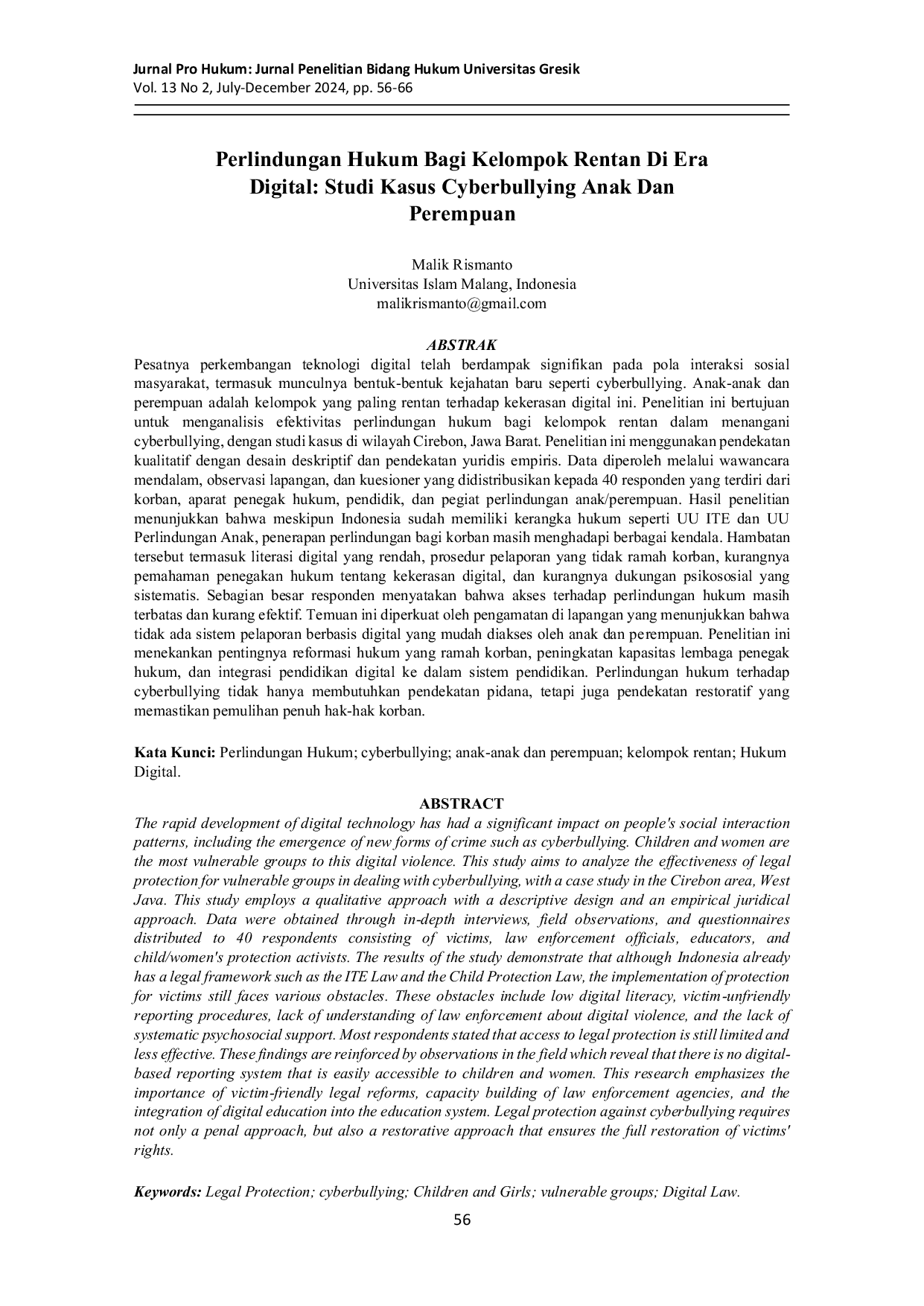 Jurnal Pro Hukum : Jurnal Penelitian Bidang Hukum Universitas GresikJurnal Pro Hukum : Jurnal Penelitian Bidang Hukum Universitas GresikPerkembangan teknologi digital telah berdampak signifikan pada pola interaksi sosial masyarakat, termasuk munculnya bentuk-bentuk kejahatan baru seperti cyberbullying. Anak-anak dan perempuan adalah kelompok yang paling rentan terhadap kekerasan digital ini. Penelitian ini bertujuan untuk menganalisis efektivitas perlindungan hukum bagi kelompok rentan dalam menangani cyberbullying, dengan studi kasus di wilayah Cirebon, Jawa Barat. Hasil penelitian menunjukkan bahwa meskipun Indonesia sudah memiliki kerangka hukum seperti UU ITE dan UU Perlindungan Anak, penerapan perlindungan bagi korban masih menghadapi berbagai kendala. Hambatan tersebut termasuk literasi digital yang rendah, prosedur pelaporan yang tidak ramah korban, kurangnya pemahaman penegakan hukum tentang kekerasan digital, dan kurangnya dukungan psikososial yang sistematis. Sebagian besar responden menyatakan bahwa akses terhadap perlindungan hukum masih terbatas dan kurang efektif. Temuan ini diperkuat oleh pengamatan di lapangan yang menunjukkan bahwa tidak ada sistem pelaporan berbasis digital yang mudah diakses oleh anak dan perempuan. Penelitian ini menekankan pentingnya reformasi hukum yang ramah korban, peningkatan kapasitas lembaga penegak hukum, dan integrasi pendidikan digital ke dalam sistem pendidikan. Perlindungan hukum terhadap cyberbullying tidak hanya membutuhkan pendekatan pidana, tetapi juga pendekatan restoratif yang memastikan pemulihan penuh hak-hak korban.
