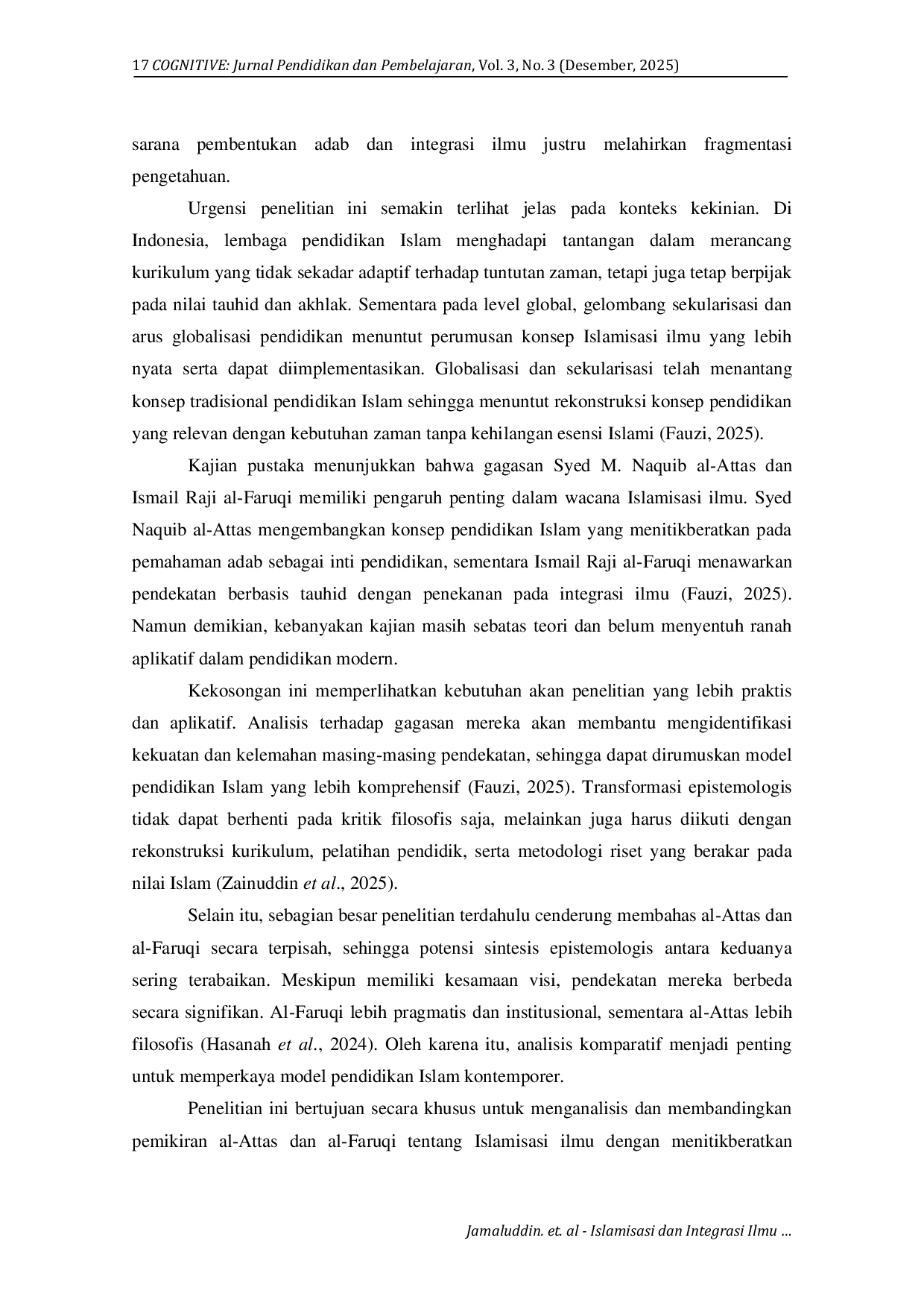Cognitive: Jurnal Pendidikan dan PembelajaranCognitive: Jurnal Pendidikan dan PembelajaranFenomena globalisasi dan modernitas memberikan pengaruh signifikan terhadap perkembangan ilmu pengetahuan dan pendidikan di dunia Muslim, terutama melalui dominasi paradigma sekuler yang memisahkan rasionalitas dari spiritualitas. Situasi ini melahirkan krisis epistemologis yang berimplikasi pada terfragmentasinya pengetahuan serta munculnya kebingungan identitas, baik secara intelektual maupun spiritual. Penelitian ini diarahkan untuk mengkaji konsep Islamisasi dan integrasi ilmu pengetahuan dalam perspektif Syed Muhammad Naquib al-Attas, dengan menyoroti implikasi teoretis sekaligus praktisnya bagi pendidikan Islam. Metode yang digunakan adalah kualitatif dengan jenis studi pustaka, melalui tahapan identifikasi sumber, penelusuran literatur, seleksi berdasarkan kriteria relevansi, pencatatan serta dokumentasi, hingga pengorganisasian data untuk dianalisis lebih lanjut. Analisis dilakukan secara deskriptif-analitis serta kritis-komparatif guna menemukan pola makna yang selaras dengan worldview Islam. Hasil penelitian menunjukkan bahwa Islamisasi ilmu dimaknai sebagai upaya membebaskan pengetahuan dari hegemoni sekularisme Barat, sedangkan integrasi ilmu menekankan pentingnya penyatuan agama, sains, dan etika dengan tauhid sebagai fondasi utamanya. Konsep tersebut menegaskan posisi adab sebagai inti pendidikan, sekaligus memberikan tawaran alternatif dalam pengembangan kurikulum, perumusan kebijakan, serta strategi pemberdayaan umat Islam dalam menghadapi tantangan globalisasi. Dari sisi teoretis, penelitian ini memperkaya diskursus epistemologi Islam, sementara secara praktis ia menyajikan kerangka aplikatif bagi pendidikan yang lebih kontekstual dan berorientasi pada pembentukan manusia beradab. Dengan demikian, temuan ini membuka peluang baru dalam kajian keilmuan Islam kontemporer, terutama dalam merumuskan paradigma pendidikan yang holistik dan transformatif.