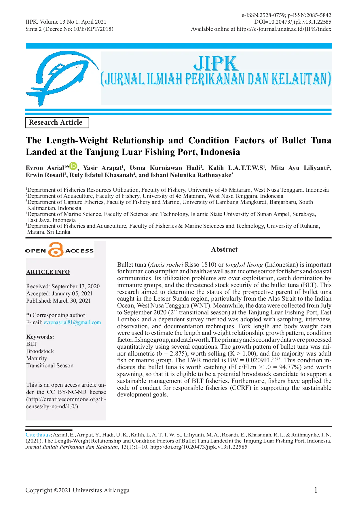 Jurnal Ilmiah Perikanan dan KelautanJurnal Ilmiah Perikanan dan KelautanBullet tuna (Auxis rochei Risso 1810) atau tongkol lisong (dalam bahasa Indonesia) penting untuk konsumsi manusia dan kesehatan, serta sebagai sumber pendapatan bagi nelayan dan masyarakat pesisir. Masalah dalam pemanfaatannya adalah over eksploitasi, dominasi tangkapan oleh kelompok yang belum dewasa, dan ancaman terhadap keamanan stok bullet tuna (BLT). Penelitian ini bertujuan untuk menentukan status calon induk potensial dari bullet tuna yang ditangkap di wilayah Nusa Tenggara Kecil, khususnya dari Selat Alas hingga Samudra Hindia, Nusa Tenggara Barat (NTB). Data dikumpulkan dari Juli hingga September 2020 (musim transisi kedua) di Pelabuhan Perikanan Tanjung Luar, Lombok Timur, dengan menggunakan metode survei dependen dan teknik pengambilan sampel, wawancara, observasi, dan dokumentasi. Data panjang dan berat badan digunakan untuk memperkirakan hubungan panjang dan berat, pola pertumbuhan, faktor kondisi, kelompok usia ikan, dan nilai tangkapan. Data primer dan sekunder diproses secara kuantitatif menggunakan beberapa persamaan. Pola pertumbuhan bullet tuna adalah minor allometric (b = 2,875), layak dijual (K > 1,00), dan sebagian besar adalah ikan dewasa atau kelompok matang. Model LWR adalah BW = 0,0209FL2,875. Kondisi ini menunjukkan bahwa bullet tuna layak ditangkap (FLc/FLm > 1,0 = 94,77%) dan layak untuk pembiakan, sehingga memenuhi syarat sebagai calon induk potensial untuk mendukung pengelolaan berkelanjutan di perikanan BLT. Selain itu, nelayan telah menerapkan Kode Perilaku untuk Perikanan Bertanggung Jawab (CCRF) dalam mendukung tujuan pembangunan berkelanjutan.