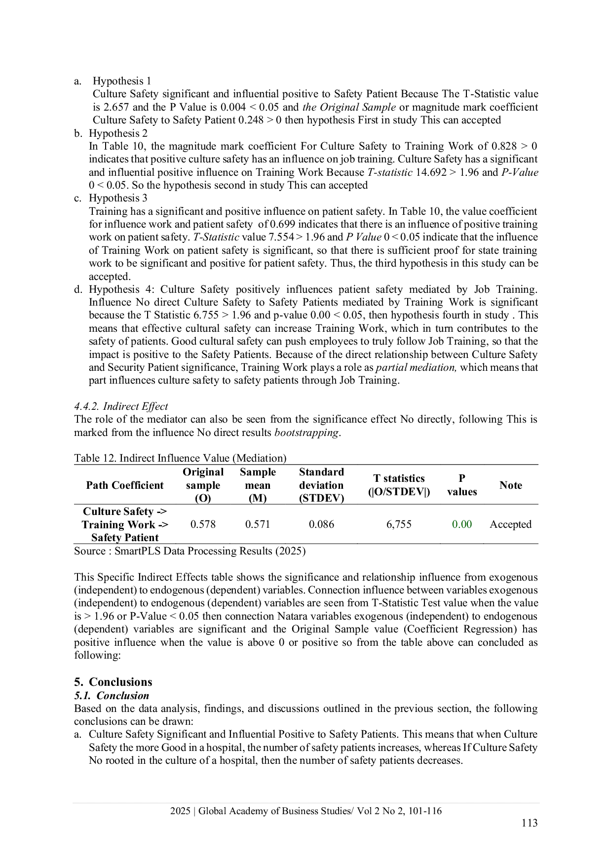 Global Academy of Business StudiesGlobal Academy of Business StudiesThis study aims to determine the effect of Safety Culture on Patient Safety, mediated by Work Training, among nurses in the Surgical Hospital CAP. The research focuses on how organizational safety values and continuous training contribute to reducing adverse events and improving healthcare service quality. A quantitative approach was employed with a sample of 100 nurses selected through purposive sampling. Data were collected using structured questionnaires and analyzed through the Structural Equation Model (SEM) using Smart PLS to examine both direct and indirect effects among variables. The results show that Safety Culture significantly affects Patient Safety, significantly influences Work Training, and Work Training significantly affects Patient Safety. Moreover, Work Training mediates the relationship between Safety Culture and Patient Safety.