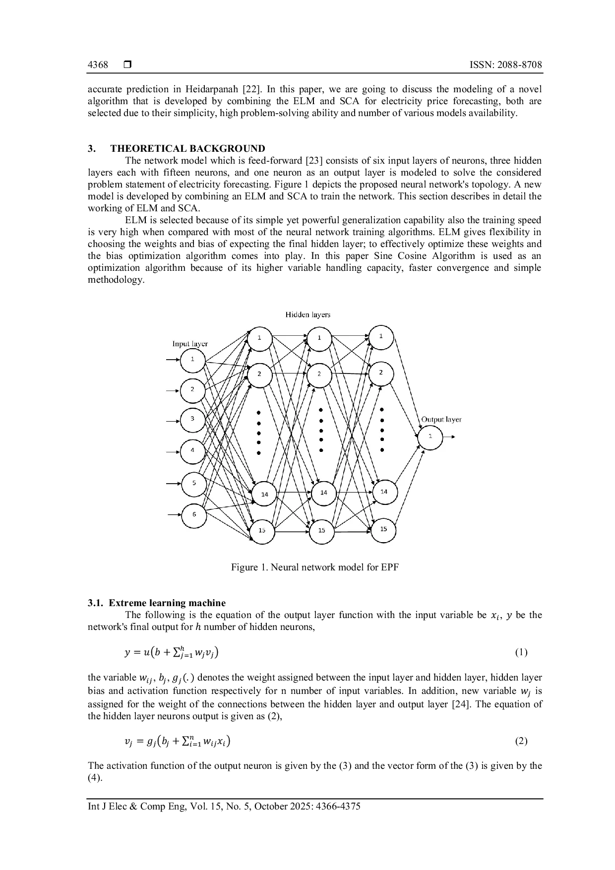 International Journal of Electrical and Computer Engineering (IJECE)International Journal of Electrical and Computer Engineering (IJECE)Permintaan listrik terus meningkat karena kemajuan teknologi baru, peralihan ke energi yang lebih ramah lingkungan, dan popularitas kendaraan listrik dibandingkan kendaraan konvensional. Proliferasi bisnis di sektor pembangkitan dan distribusi telah meningkatkan persaingan di pasar listrik. Perkiraan harga listrik memungkinkan konsumen untuk mengendalikan tagihan listrik bulanan mereka dan pembangkitan terdistribusi milik konsumen dengan mengetahui harga per jam yang diprediksi. Perkiraan harga listrik sangat penting bagi pembeli, bisnis pembangkitan, dan penawar untuk manajemen permintaan, penjadwalan pembangkitan, dan kutipan harga penawaran. Data harga listrik sangat tidak linier dan dipengaruhi oleh banyak faktor sehingga model EPF lebih kompleks, sangat mudah berubah, dan lambat dalam konvergensi. Para peneliti selama dekade terakhir telah mengusulkan berbagai model jaringan saraf, algoritma pelatihan, dan sistem hibrida yang terdiri dari dua atau lebih model untuk perkiraan harga listrik yang akurat dan efisien. Studi ini melibatkan pengembangan model jaringan saraf hibrida dengan dua algoritma cerdas, algoritma sinus kosinus (SCA) dan mesin pembelajaran ekstrem (ELM) untuk memprediksi harga listrik untuk durasi tertentu. Model jaringan yang dikembangkan baru dilatih dan diuji dengan data harga listrik India real-time dari tahun 2022. Set data harga tahunan yang dipilih dibagi menjadi tiga set berbeda untuk menjelajahi variasi musiman dan semua set diberikan sebagai input ke model untuk pelatihan dan pengujian untuk memperoleh perkiraan harga yang efektif.
