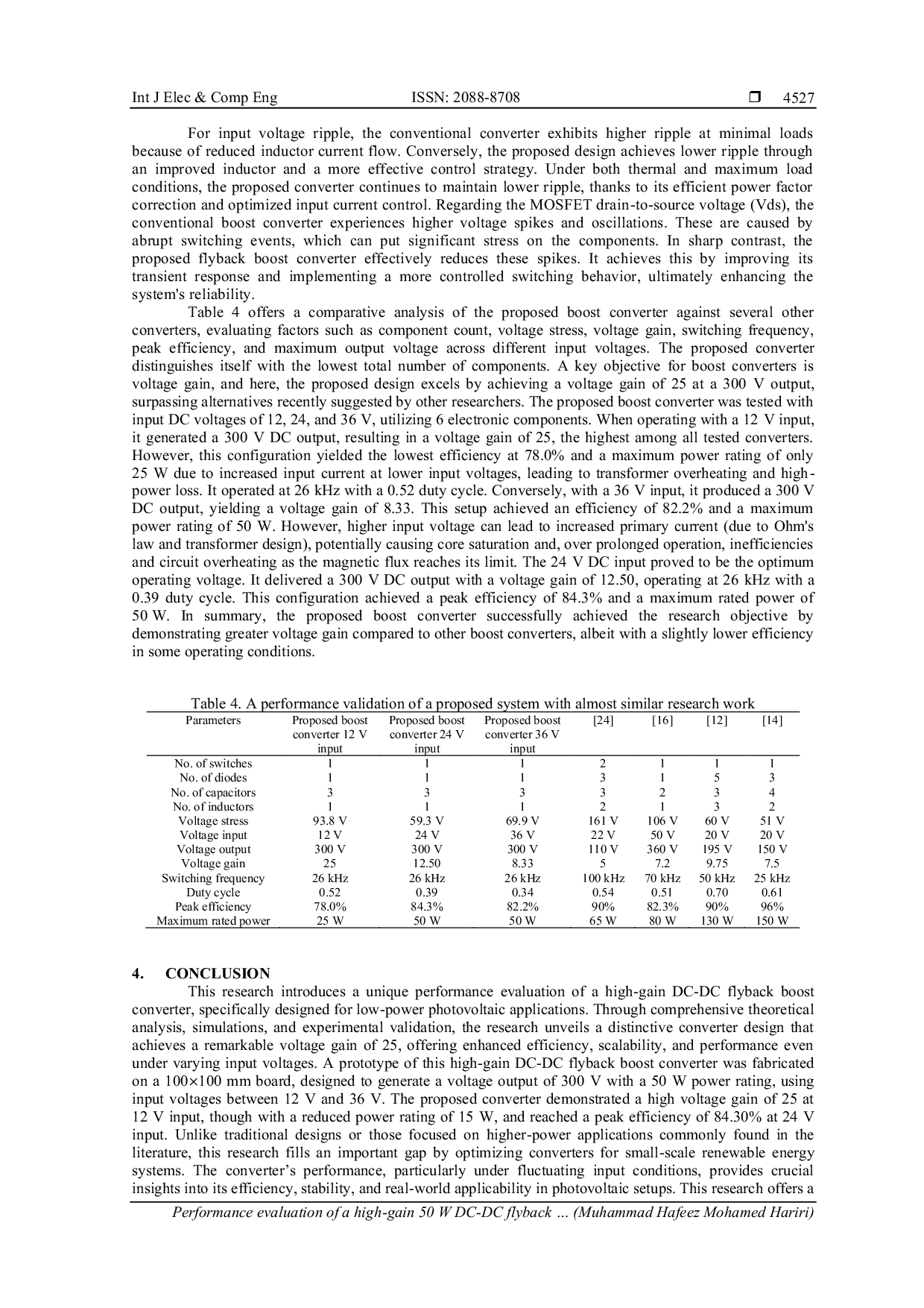 International Journal of Electrical and Computer Engineering (IJECE)International Journal of Electrical and Computer Engineering (IJECE)DC-DC boost converters are essential for stabilizing the voltage output of photovoltaic (PV) modules. This paper analyzes a unique 50 W high-gain DC-DC flyback boost converter for various input voltage PV applications. Scientific analysis was employed to determine suitable parameters for critical circuit components. Simulations were conducted to evaluate the proposed high-gain DC-DC boost converters performance. Subsequently, a prototype of the high-gain DC boost converter was fabricated with a printed circuit board (PCB) size of 100×100 mm. The proposed prototypes performance is compared to that of conventional boost converters based on criteria such as input voltage, output voltage, component count, voltage stress, voltage gain, efficiency, and rated power. The results indicate that the proposed converter can achieve a 300 V output voltage with a 50 W power rating from variable input voltages ranging between 12 V and 36 V. The highest gain achieved was 25 with a 12 V input voltage, though at a lower power rating of 15 W. A peak efficiency of 84.30% was measured with a 24 V DC input voltage. The proposed converters features, particularly its high step-up voltage gain, make it suitable for industrial and renewable energy applications.