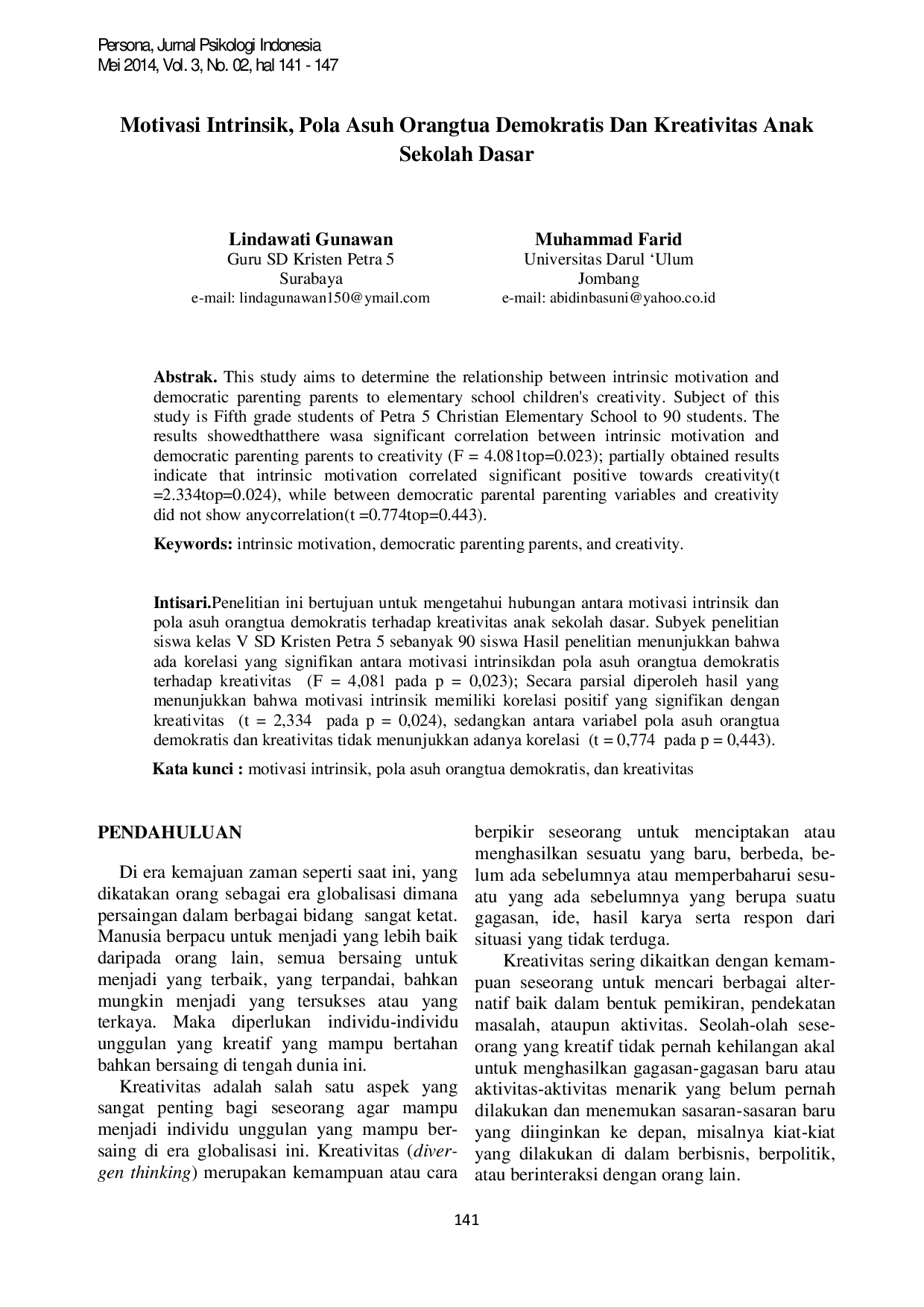 Persona:Jurnal Psikologi IndonesiaPersona:Jurnal Psikologi IndonesiaPenelitian ini bertujuan untuk mengetahui hubungan antara motivasi intrinsik dan pola asuh orangtua demokratis terhadap kreativitas anak sekolah dasar. Subyek penelitian siswa kelas V SD Kristen Petra 5 sebanyak 90 siswa Hasil penelitian menunjukkan bahwa ada korelasi yang signifikan antara motivasi intrinsik dan pola asuh orangtua demokratis terhadap kreativitas (F = 4,081 pada p = 0,023); Secara parsial diperoleh hasil yang menunjukkan bahwa motivasi intrinsik memiliki korelasi positif yang signifikan dengan kreativitas (t = 2,334 pada p = 0,024), sedangkan antara variabel pola asuh orangtua demokratis dan kreativitas tidak menunjukkan adanya korelasi (t = 0,774 pada p = 0,443).