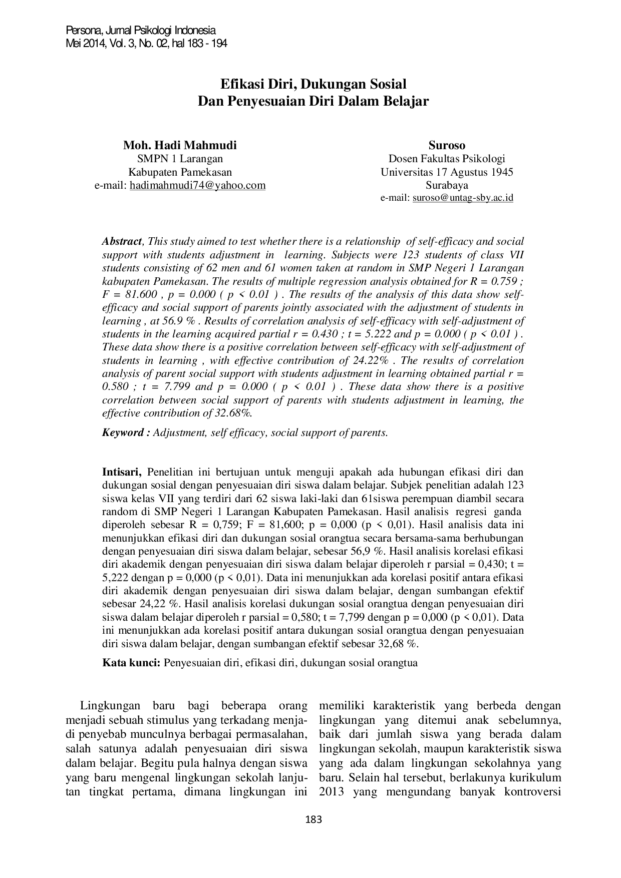 Dari hasil perhitungan uji statistik, dapat disimpulkan bahwa ada hubungan positif secara bersama-sama antara efikasi diri dan dukungan sosial orangtua terhadap penyesuaian diri siswa.Korelasi terjadi karena semakin tinggi skor efikasi diri dan dukungan sosial orangtua, maka semakin tinggi pula skor penyesuaian diri siswa dalam belajar.Begitu pula efikasi diri pada siswa secara tersendiri juga memberikan pengaruh terhadap penyesuaian diri siswa dalam belajar, sehingga bagi siswa yang memiliki tingkat efikasi diri yang tinggi akan sangat membantu dalam meningkatkan kemampuan penyesuaian diri siswa dalam belajar.Disisi lain, dukungan sosial orangtua, juga memberikan pengaruh terhadap penyesuaian diri siswa dalam belajar, sehingga bagi siswa yang memiliki tingkat dukungan sosial dari orangtua yang tinggi akan sangat membantu dalam meningkatkan kemampuan penyesuaian diri siswa dalam belajar.