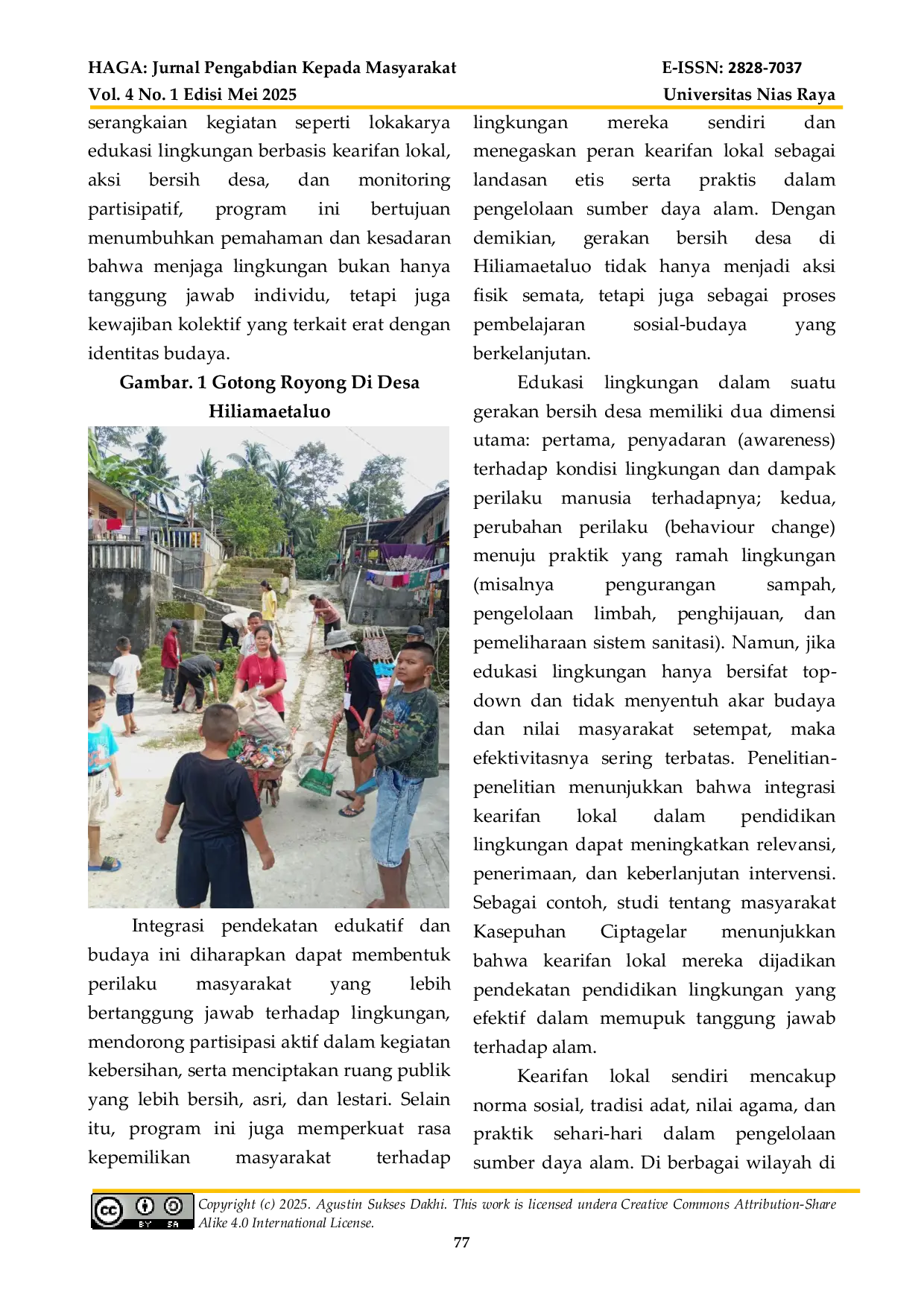 Haga : Jurnal Pengabdian Kepada MasyarakatHaga : Jurnal Pengabdian Kepada MasyarakatPengabdian masyarakat ini bertujuan untuk meningkatkan kesadaran lingkungan melalui integrasi edukasi lingkungan dan kearifan lokal di Desa Hiliamaetaluo, Kabupaten Nias Selatan. Desa ini memiliki potensi sosial-budaya yang tinggi dengan nilai-nilai kearifan lokal seperti gotong-royong, larangan membuang sampah ke sungai, dan penghormatan terhadap alam yang diwariskan oleh leluhur. Namun, praktik pengelolaan lingkungan masih menghadapi tantangan, termasuk kebiasaan membuang sampah sembarangan, terbatasnya sarana pendukung, serta kurangnya kesadaran generasi muda terhadap nilai-nilai adat. Kegiatan pengabdian dilaksanakan melalui beberapa tahap: identifikasi masalah lingkungan, lokakarya edukasi lingkungan berbasis kearifan lokal, aksi bersih desa, dan evaluasi partisipatif masyarakat. Metode ini memadukan pendekatan partisipatif, pendidikan, dan budaya lokal sehingga memudahkan masyarakat memahami pentingnya menjaga lingkungan sekaligus menanamkan nilai budaya. Hasil kegiatan menunjukkan peningkatan partisipasi masyarakat, perubahan perilaku awal dalam pemilahan dan pengelolaan sampah, penghijauan area publik, serta terbentuknya kesadaran kolektif untuk menjaga lingkungan. Selain itu, kegiatan ini memperkuat rasa memiliki masyarakat terhadap program, menjadikan nilai-nilai kearifan lokal sebagai landasan etis dan praktis dalam pengelolaan lingkungan. Pengabdian ini menegaskan bahwa integrasi edukasi lingkungan dan kearifan lokal dapat menjadi strategi efektif untuk pembangunan berkelanjutan di tingkat desa, sekaligus memperkuat identitas budaya dan solidaritas sosial masyarakat. Model ini memiliki potensi direplikasi di desa lain dengan konteks budaya serupa.