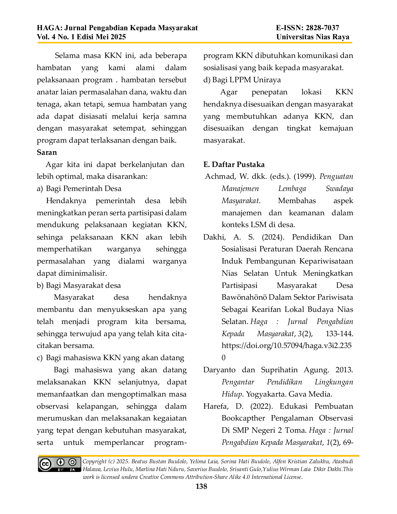 Haga : Jurnal Pengabdian Kepada MasyarakatHaga : Jurnal Pengabdian Kepada MasyarakatPengabdian kepada masyarakat yang dilakukan oleh Universitas Nias Raya melalui program Kuliah Kerja Nyata (KKN) bertujuan untuk melaksanakan pengabdian terhadap masyarakat, mengenalkan mahasiswa dalam kehidupan bermasyarakat, memperluas hubungan baik antara universitas dengan pemerintah dan masyarakat sasaran, serta membantu ketersediaan data atau profil desa untuk perencanaan pembangunan berkelanjutan. KKN dilaksanakan di beberapa desa di Kabupaten Nias Selatan, termasuk Desa Hilindraso, dengan fokus pada identifikasi dan analisis data untuk pengembangan desa. Program-program KKN dirancang secara sistematis dan seimbang, melibatkan diskusi dengan kelompok KKN, aparat desa, dan masyarakat setempat. Hasil yang dicapai meliputi pembuatan tempat sampah, sapu lidi, sapta pesona, gotong royong, dan perayaan Hari Kemerdekaan Indonesia.