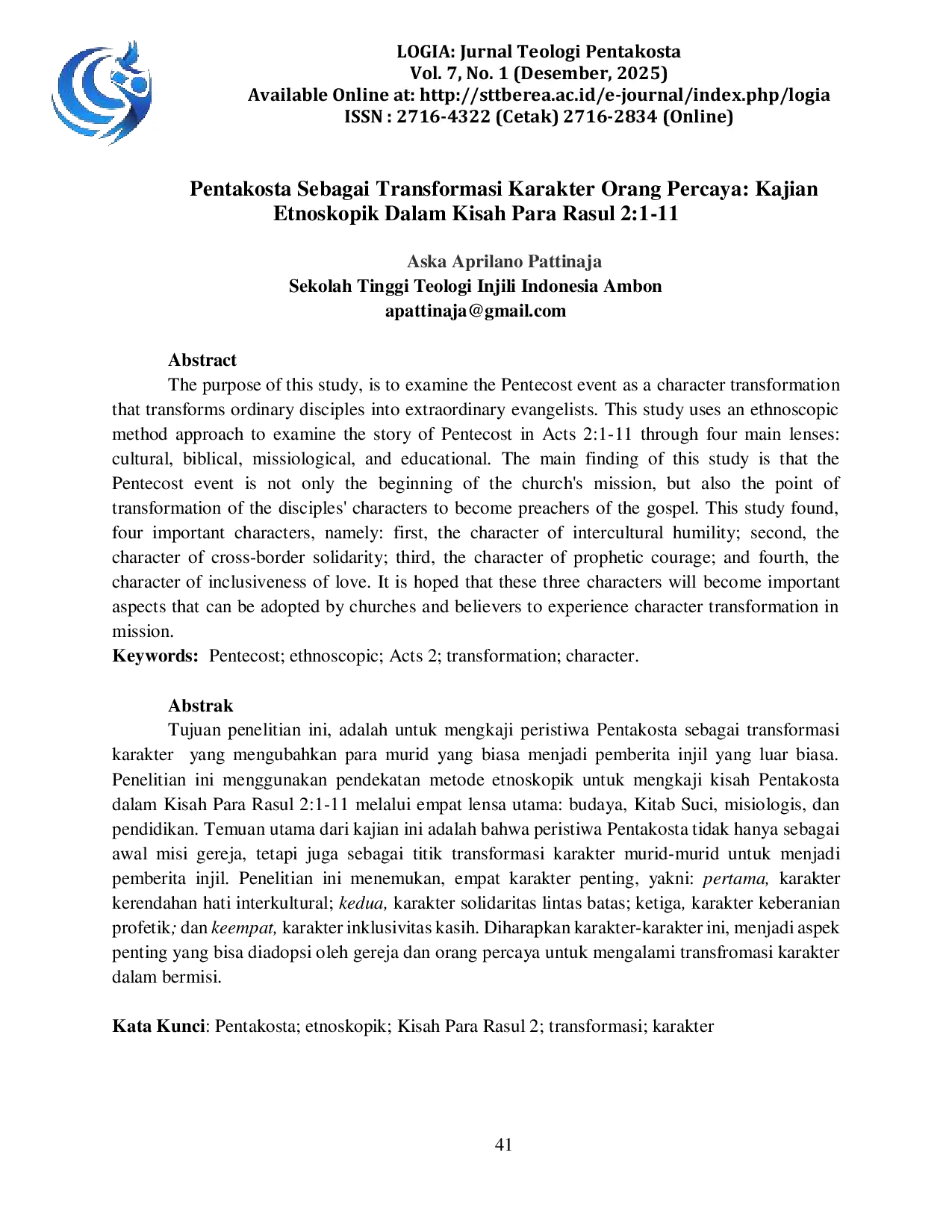 LOGIA: Jurnal Teologi PentakostaLOGIA: Jurnal Teologi PentakostaTujuan penelitian ini, adalah untuk mengkaji peristiwa Pentakosta sebagai transformasi karakter yang mengubah para murid yang biasa menjadi pemberita injil yang luar biasa. Penelitian ini menggunakan pendekatan metode etnoskopik untuk mengkaji kisah Pentakosta dalam Kisah Para Rasul 2:1-11 melalui empat lensa utama: budaya, Kitab Suci, misiologis, dan pendidikan. Temuan utama dari kajian ini adalah bahwa peristiwa Pentakosta tidak hanya sebagai awal misi gereja, tetapi juga sebagai titik transformasi karakter murid-murid untuk menjadi pemberita injil. Penelitian ini menemukan, empat karakter penting, yakni: pertama, karakter kerendahan hati interkultural; kedua, karakter solidaritas lintas batas; ketiga, karakter keberanian profetik; dan keempat, karakter inklusivitas kasih. Diharapkan karakter-karakter ini, menjadi aspek penting yang bisa diadopsi oleh gereja dan orang percaya untuk mengalami transformasi karakter dalam bermisi.