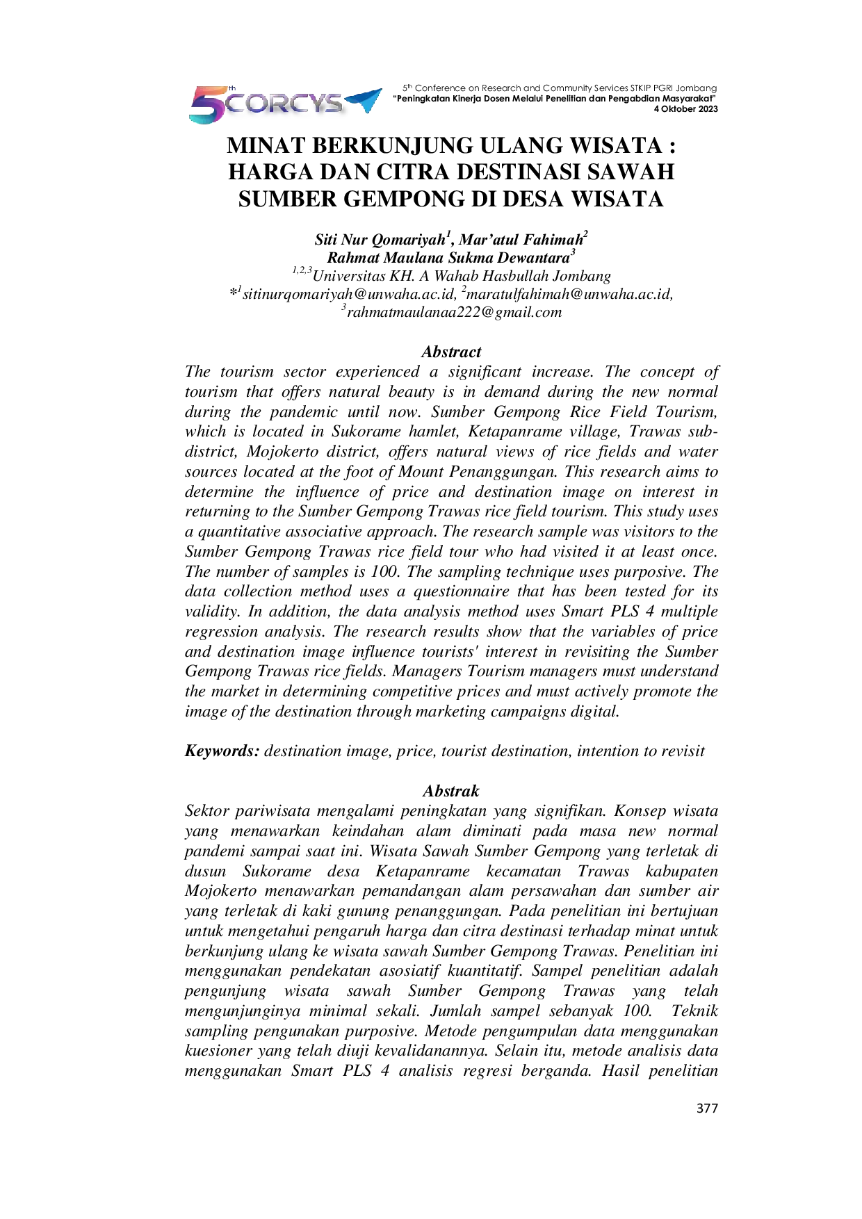 Prosiding Conference on Research and Community ServicesProsiding Conference on Research and Community ServicesSektor pariwisata mengalami peningkatan signifikan, dengan konsep wisata alam yang semakin diminati. Penelitian ini bertujuan untuk mengetahui pengaruh harga dan citra destinasi terhadap minat kunjungan ulang ke wisata sawah Sumber Gempong Trawas. Penelitian ini menggunakan pendekatan asosiatif kuantitatif dengan sampel 100 pengunjung yang telah mengunjungi wisata tersebut minimal sekali. Data dikumpulkan melalui kuesioner yang telah diuji validitasnya dan dianalisis menggunakan analisis regresi berganda Smart PLS 4. Hasil penelitian menunjukkan bahwa harga dan citra destinasi berpengaruh terhadap minat wisatawan untuk mengunjungi ulang wisata persawahan Sumber Gempong Trawas. Pengelola wisata harus memahami pasar dalam menentukan harga yang kompetitif dan aktif mempromosikan citra destinasi melalui kampanye pemasaran digital.