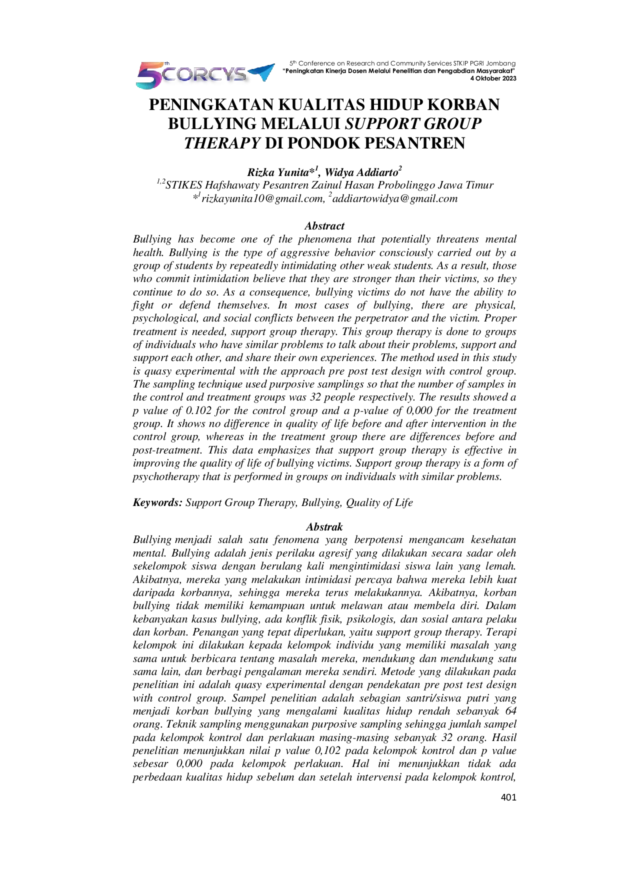 Prosiding Conference on Research and Community ServicesProsiding Conference on Research and Community ServicesBullying menjadi salah satu fenomena yang berpotensi mengancam kesehatan mental. Bullying adalah jenis perilaku agresif yang dilakukan secara sadar oleh sekelompok siswa dengan berulang kali mengintimidasi siswa lain yang lemah. Akibatnya, mereka yang melakukan intimidasi percaya bahwa mereka lebih kuat daripada korbannya, sehingga mereka terus melakukannya. Akibatnya, korban bullying tidak memiliki kemampuan untuk melawan atau membela diri. Dalam kebanyakan kasus bullying, ada konflik fisik, psikologis, dan sosial antara pelaku dan korban. Penanganan yang tepat diperlukan, yaitu support group therapy. Terapi kelompok ini dilakukan kepada kelompok individu yang memiliki masalah yang sama untuk berbicara tentang masalah mereka, mendukung dan mendukung satu sama lain, dan berbagi pengalaman mereka sendiri. Metode yang dilakukan pada penelitian ini adalah quasy experimental dengan pendekatan pre post test design with control group. Sampel penelitian adalah sebagian santri/siswa putri yang menjadi korban bullying yang mengalami kualitas hidup rendah sebanyak 64 orang. Teknik sampling menggunakan purposive sampling sehingga jumlah sampel pada kelompok kontrol dan perlakuan masing-masing sebanyak 32 orang. Hasil penelitian menunjukkan nilai p value 0,102 pada kelompok kontrol dan p value sebesar 0,000 pada kelompok perlakuan. Hal ini menunjukkan tidak ada perbedaan kualitas hidup sebelum dan setelah intervensi pada kelompok kontrol, sedangkan pada kelompok perlakuan terdapat perbedaan sebelum dan setelah perlakuan. Data ini mempertegas bahwa support group therapy efektif untuk meningkatkan kualitas hidup korban bullying. Support group therapy merupakan bentuk psikoterapi yang dilakukan secara berkelompok pada individu yang memiliki permasalahan yang sama.