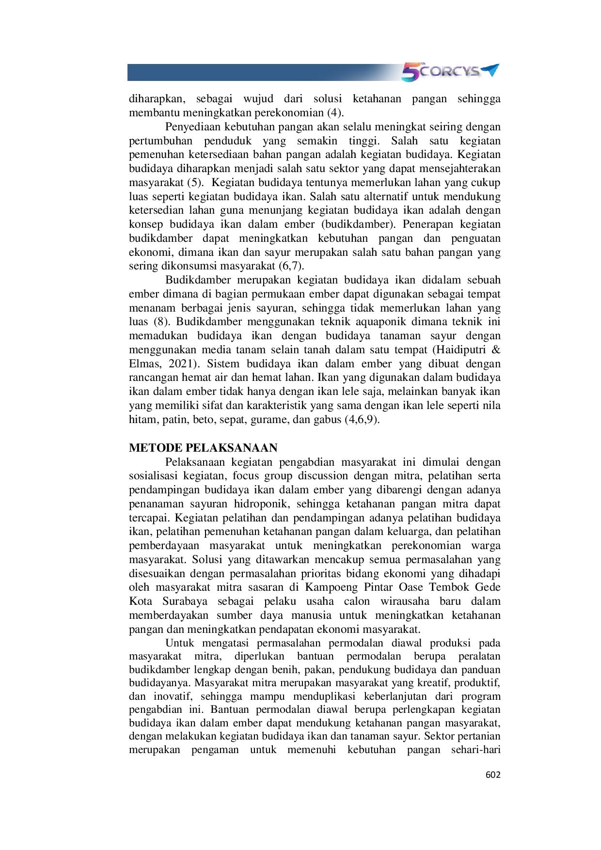 Prosiding Conference on Research and Community ServicesProsiding Conference on Research and Community ServicesMasyarakat Kampoeng Pintar Oase Tembok Gede Kota Surabaya merupakan Masyarakat ekonomi non produktif di kampung dengan gang sempit yang letaknya dipusat tengah kota Surabaya. Dahulu, kampung ini merupakan daerah yang gersang dan kumuh, dengan adanya dukungan bantuan dari pemerintah kota, kampung ini mulai berbenah. Dukungan permodalan lebih lanjut perlu diupayakan untuk lebih meningkatkan perekonomian masyarakat, terutama pada aspek ketahanan pangan dan peningkatan pendapatan. Budikdamber merupakan inovasi yang bisa dilakukan, yaitu dengan memelihara atau budidaya ikan dan berkebun sayur meskipun pada lahan yang sempit. Profil masyarakat yang memiliki keinginan dan kreatifitas yang tinggi, menjadi faktor utama pendukung keberhasilan program ini. Tujuan: Pelaksanaan pengabdian kemitraan masyarakat ini bertujuan untuk memperkuat ketahanan pangan dan peningkatan pendapatan ekonomi masyarakat Kampoeng Pintar Oase Tembok Gede Kota Surabaya, melalui dukungan pelatihan budidaya ikan dalam ember, pelatihan pengolahan pasca panen, pengemasan dan pemasaran melalui digital marketing. Tahapan metode pengabdian: untuk mengatasi permasalahan mitra pengabdian dilaksanakan beberapa metode pelaksanaan, dimulai dari tahap solusi bidang produksi, dengan pemberian bantuan berupa peralatan budikdamber beserta dengan kelengkapan benih lele dan lobster. Penerapan budikdamber sebagai pengembangan sistem akuaponik diharapkan mampu menjadi solusi ketahanan pangan bagi warga masyarakat untuk memenuhi kebutuhan hidup keluarga. Tahap kedua meliputi solusi bidang manajemen usaha. Luaran Peningkatan keduameliputi pemberdayaan masyarakat berupa peningkatan keterampilan mitra dalam budidaya ikan dalam ember, sebagai upaya untuk peningkatan ketahanan pangan dan peningkatan pendapatan ekonomi.