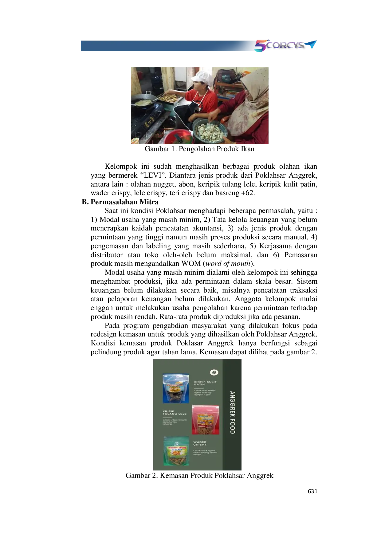 Prosiding Conference on Research and Community ServicesProsiding Conference on Research and Community ServicesKemasan merupakan unsur penting dalam pemasaran produk. Kemasan memiliki fungsi sebagai pelindung kualitas produk. Selain itu, membantu konsumen dalam membedakan produk dengan yang lainnya serta dapat membentuk identitas produk. Kemasan dapat menyampaikan pesan kepada konsumen mengenai nilai suatu produk. Pada skala UMKM (usaha mikro kecil dan menengah) sering terjadi tidak memperhatikan hal ini. Pada Poklahsar (kelompok pengolah dan pemasar ikan) Anggrek pengemasan masih sederhana. Kemasan berupa plastik standing pouch dan label. Produk olahan ikan memiliki potensi besar untuk pertumbuhan ekonomi, namun seringkali menghadapi kendala dalam pemasaran dan daya tarik produk. Pada pengabdian masyarakat ini bertujuan untuk meningkatkan daya saing produk olahan ikan melalui proses redesain kemasan. Metode yang digunakan adalah pelatihan secara bersama-sama dan secara mandiri perorangan. Pengabdian masyarakat ini memberikan edukasi kepada Poklahsar dalam pelatihan keterampilan pembuatan desain untuk mengatasi permasalahan kemasan yang kurang menarik.