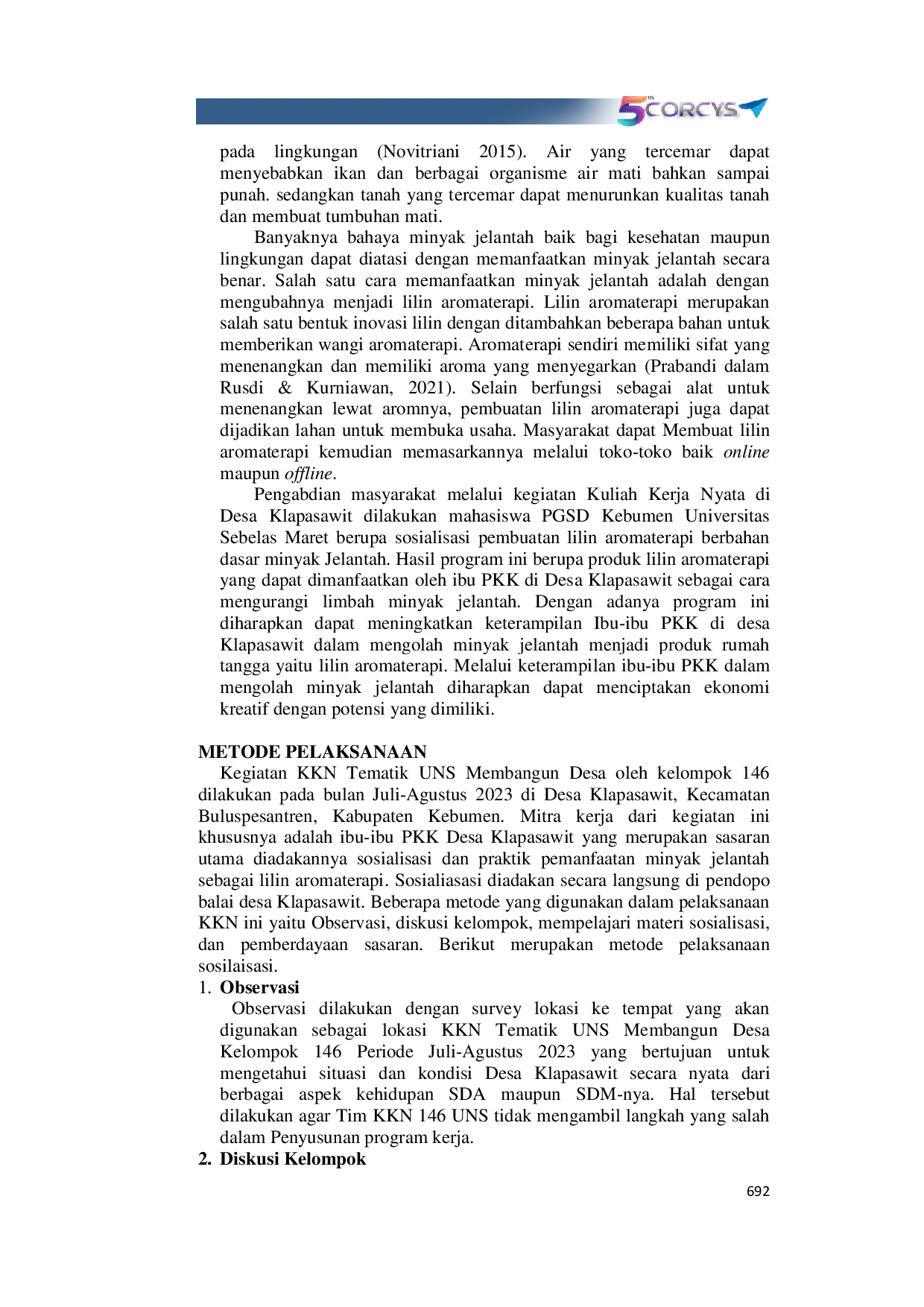 Prosiding Conference on Research and Community ServicesProsiding Conference on Research and Community ServicesKegiatan Kuliah Kerja Nyata (KKN) Tematik Universitas Sebelas Maret (UNS) Membangun Desa Kelompok 146 Periode Juli-Agustus 2023 bertujuan untuk meningkatkan pengetahuan dan keterampilan anggota PKK Desa Klapasawit dalam memanfaatkan minyak jelantah menjadi barang yang memiliki nilai guna. Kegiatan dilakukan pada tanggal 7 Agustus 2023. Sebelum memulai kegiatn kelompok melalui beberapa tahapan, antara lain studi Pustaka, mencari bahan, kemudian praktik sosialisasi. Gagasan proyek ini adalah untuk mengolah minyak minyak jelantah menjadi lilin aromaterapi yang memiliki nilai jual. Minyak jelanyah adalah minyak yang sudah digubakan lebih dari 3 kali untuk memasak.