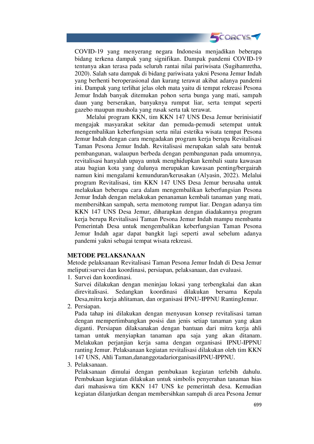 Prosiding Conference on Research and Community ServicesProsiding Conference on Research and Community ServicesPotensi alam harus dimanfaatkan untuk menunjang keberlangsungan hidup masyarakat sekitar. Potensi ini bisa dinikmati oleh khalayak umum salah satunya keindahan alam yang berada di daerah tersebut. Keindahan alam yang dikelola menjadi tempat wisata dengan baik akan meningkatkan perekonomian masyarakat sekitar dan pemerintah desa. Salah satu desa yang memiliki keindahan alam adalah Desa Jemur. Desa Jemur memiliki keindahan alam salah satunya adalah sungai Lukulo dan terdapat Areal Bendung Intake Kedungsamak. Pada sekitar Areal Bendung Intake Kedungsamak sempat dijadikan sebagai tempat rekreasi keluarga yang diberi nama Pesona Jemur Indah. Setelah beberapa bulan beroperasi dan sempat ramai pengunjung ternyata tempat rekreasi tersebut harus berhenti karena pandemi COVID-19 dan berdampak sampai sekarang. Akibatnya tempat tersebut tidak ada yang mengelola sehingga menjadi terbengkalai. Solusi yang bisa dilakukan oleh tim KKN 147 UNS dengan melakukan “ yang dibantu oleh Pemerintah Desa Jemur, Ikatan Pelajar Nahdlatul Ulama (IPNU), Ikatan Pelajar Putri Nahdlatul Ulama (IPPNU), dan seorang ahli taman. Metode pelaksanaan yang dilakukan meliputi; survei dan koordinasi, persiapan, pelaksanaan, dan evaluasi. Hasil penelitian ini menunjukkan taman menjadi bersih dari sampah serta terdapat berbagai tanaman yang menghiasi taman.
