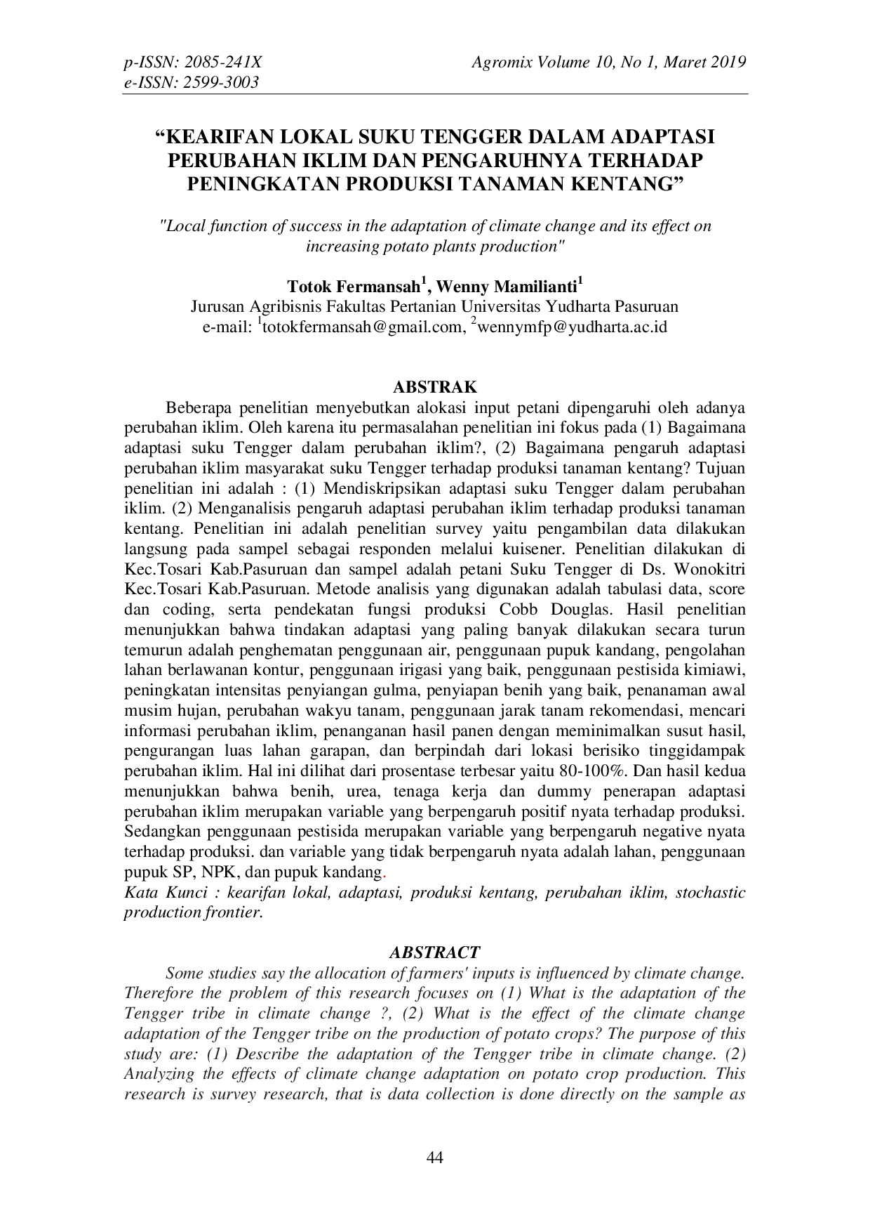 AGROMIXAGROMIXBeberapa penelitian menyebutkan alokasi input petani dipengaruhi oleh adanya perubahan iklim. Oleh karena itu permasalahan penelitian ini fokus pada (1) Bagaimana adaptasi suku Tengger dalam perubahan iklim?, (2) Bagaimana pengaruh adaptasi perubahan iklim masyarakat suku Tengger terhadap produksi tanaman kentang? Tujuan penelitian ini adalah: (1) Mendiskripsikan adaptasi suku Tengger dalam perubahan iklim. (2) Menganalisis pengaruh adaptasi perubahan iklim terhadap produksi tanaman kentang. Penelitian ini adalah penelitian survey yaitu pengambilan data dilakukan langsung pada sampel sebagai responden melalui kuisener. Penelitian dilakukan di Kec. Tosari Kab. Pasuruan dan sampel adalah petani Suku Tengger di Ds. Wonokitri Kec. Tosari Kab. Pasuruan. Metode analisis yang digunakan adalah tabulasi data, score dan coding, serta pendekatan fungsi produksi Cobb Douglas. Hasil penelitian menunjukkan bahwa tindakan adaptasi yang paling banyak dilakukan secara turun temurun adalah penghematan penggunaan air, penggunaan pupuk kandang, pengolahan lahan berlawanan kontur, penggunaan irigasi yang baik, penggunaan pestisida kimiawi, peningkatan intensitas penyiangan gulma, penyiapan benih yang baik, penanaman awal musim hujan, perubahan waktu tanam, penggunaan jarak tanam rekomendasi, mencari informasi perubahan iklim, penanganan hasil panen dengan meminimalkan susut hasil, pengurangan luas lahan garapan, dan berpindah dari lokasi berisiko tinggi dampak perubahan iklim. Hal ini dilihat dari prosentase terbesar yaitu 80-100%. Dan hasil kedua menunjukkan bahwa benih, urea, tenaga kerja dan dummy penerapan adaptasi perubahan iklim merupakan variabel yang berpengaruh positif nyata terhadap produksi. Sedangkan penggunaan pestisida merupakan variabel yang berpengaruh negatif nyata terhadap produksi. Dan variabel yang tidak berpengaruh nyata adalah lahan, penggunaan pupuk SP, NPK, dan pupuk kandang.