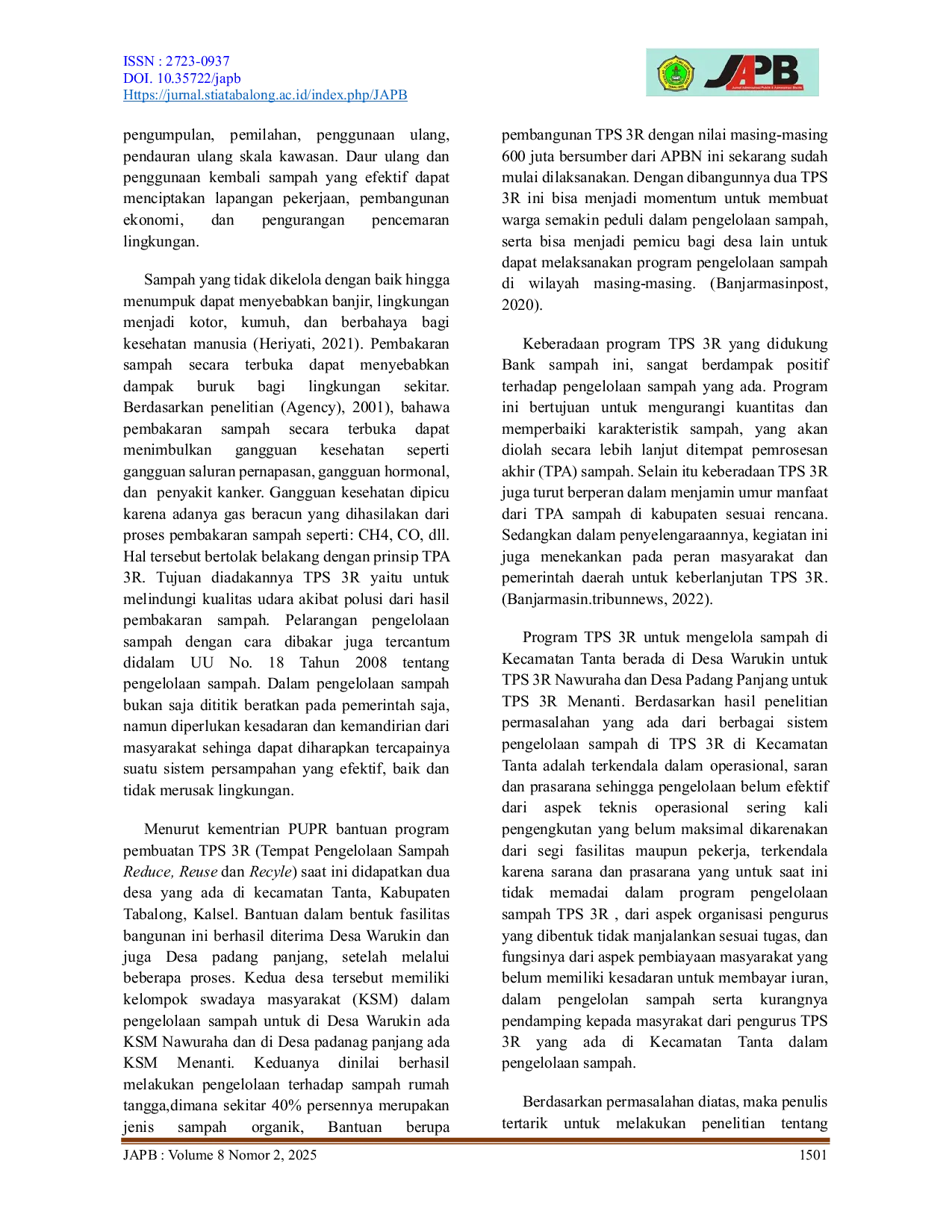 JAPBJAPBTPS 3R adalah pendekatan pengelolaan sampah pada skala komunal, melibatkan pemerintah dan masyarakat, termasuk yang berpenghasilan rendah di permukiman padat. Mengutamakan prinsip Reduce, Reuse, dan Recycle, TPS 3R mengurangi sampah dari sumbernya dan beban di TPA. Fasilitas TPS 3R penting untuk pengelolaan sampah yang efektif. Tujuan penelitian ini adalah untuk mengetahui efektivitas pengelolaan sampah berbasis TPS 3R serta untuk mengetahui faktor-faktor yang mempengaruhi efektivitas pengelolaan sampah berbasis TPS 3R pada TPS 3R di kecamatan Tanta kabupaten Tabalong. Metode penelitian yang digunakan dalam penelitian ini adalah jenis penelitian deskriptif dengan pendekatan kualitatif. Sumber data yang digunakan dalam penelitian ini adalah data primer dan data sekunder. Teknik pengumpulan data dilakukan dengan observasi, dokumentasi dan wawancara kepada informan yang berjumlah 6 orang. Teknik analisis data yang digunakan dalam penelitian ini menggunakan model interaktif untuk menganalisis data hasil penelitian yaitu menggunakan reduksi data, penyajian data dan penarikan kesimpulan. Hasil penelitian ini menunjukan bahwa efektivitas pengelolaan sampah berbasis TPS 3R pada TPS 3R di kecamatan Tanta kabupaten Tabalong Belum Efektif. Hal ini dinyatakan dari 3 indikator hanya 1 indikator yang sudah efektif, yaitu ketepatan sasaran, Adapun faktor penghambat Program TPS 3R di Kecamatan Tanta, Kabupaten Tabalong menghadapi kendala berupa kurangnya tenaga kerja, sarana dan prasarana yang tidak memadai, serta keterbatasan dana, Selain itu, partisipasi masyarakat yang minim juga menghambat jalannya program.