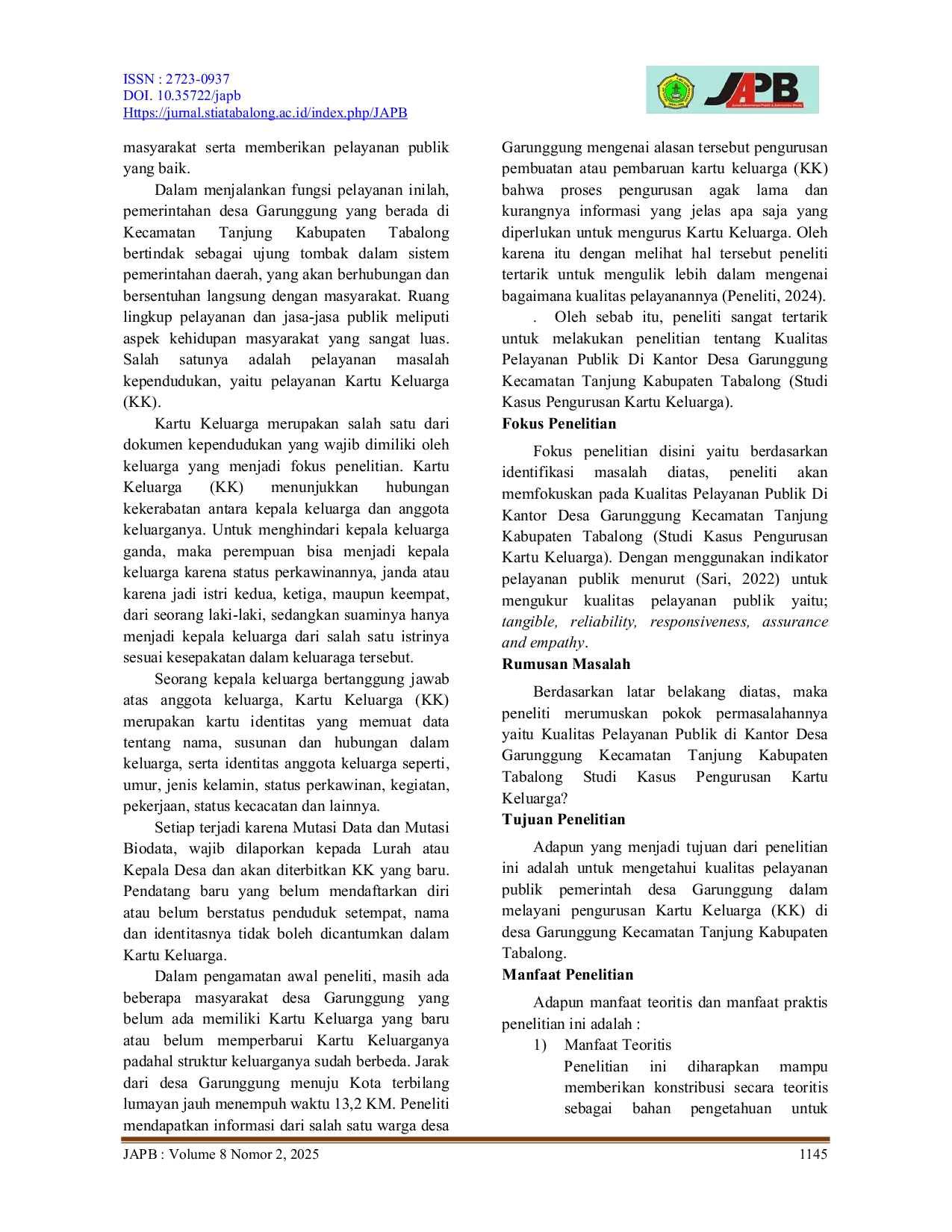 JAPBJAPBPelayanan merupakan tugas utama yang paling penting dari sosok aparatur sebagai abdi negara dan abdi masyarakat. Sebagai abdi masyarakat mengandung pengertian bahwa dalam melaksanakan tugasnya harus tetap berusaha melayani kepentingan masyarakat dan memperlancar segala urusan masyarakat. Keberhasilan suatu pelayanan berdasarkan pada rasa puas masyarakat memerlukan pelayanan bisa diartikan dengan memperbandingkan bagaimana pandangan antara pelayanan yang diterima dengan harapan pelayanan yang diharapkan. Tujuan penelitian ini adalah untuk mengetahui kualitas pelayanan publik pemerintah desa Garunggung dalam melayani pengurusan Kartu Keluarga (KK) di desa Garunggung Kecamatan Tanjung Kabupaten Tabalong. Penelitian ini menggunakan pendekatan deskritif kualitatif. Adapun yang menjadi informan dalam penelitian ini adalah berjumlah 5 orang. Teknik pengumpulan data dalam penelitian ini yaitu observasi, wawancara dan dokumentasi. Teknik analisis data yang digunakan dalam penelitian ini yaitu data reduction, data display, dan conclusion drawing/varification. Sedangkan keabsahan data pada penelitian ini menggunakan triangulasi. Hasil penelitian ini menunjukkan bahwa kualitas pelayanan publik di Kantor Desa Garunggung Kecamatan Tanjung Kabupaten Tabalong dalam penggurusan kartu keluarga belum sepenuhnya baik atau masih belum berkualitas.