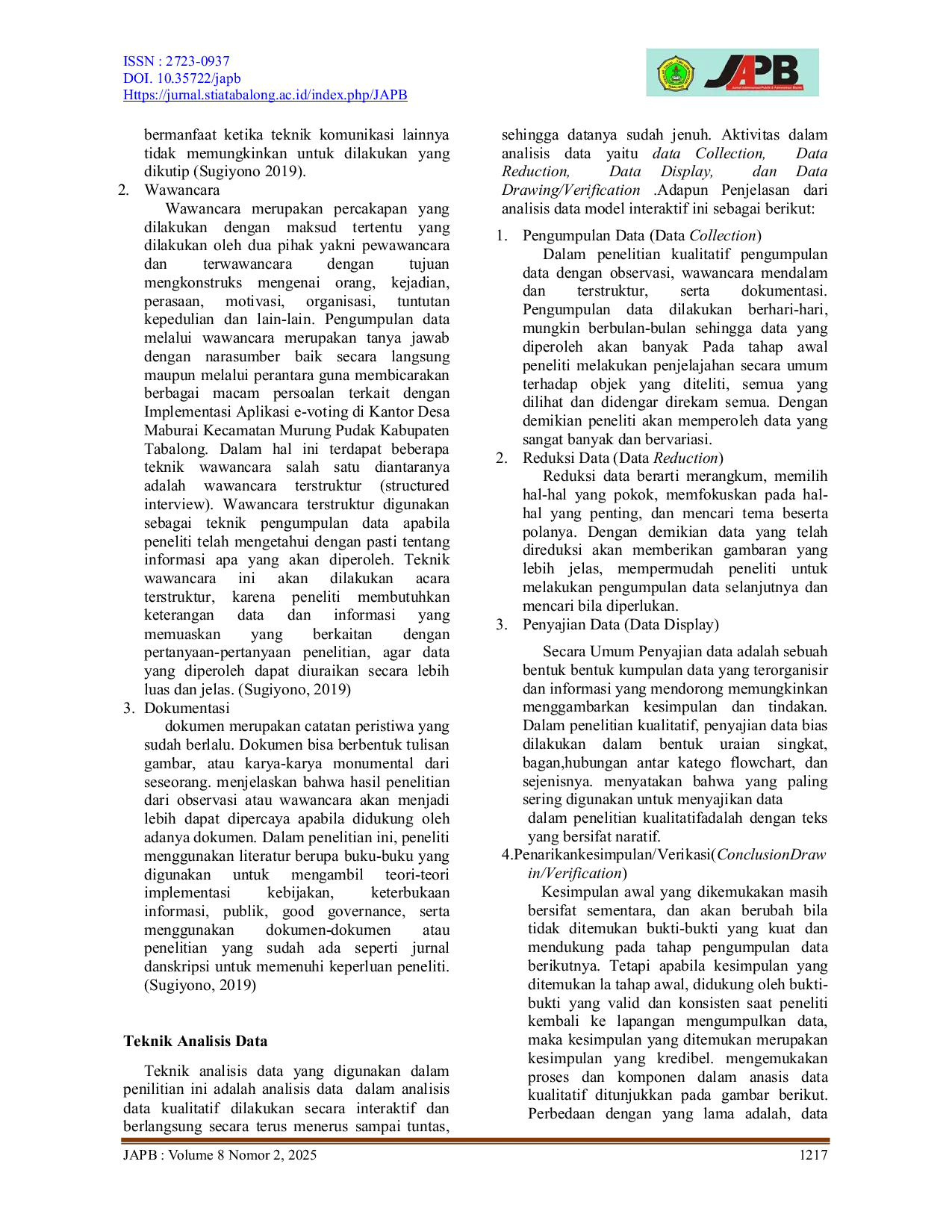 JAPBJAPBImplementasi merupakan pelaksanaan atau penerapan kebijakan dasar, biasanya dalam bentuk undang-undang, namun dapat pula berbentuk perintah atau keputusan eksekutif badan peradilan. Tujuan dari penelitian ini adalah untuk mengetahui Implementasi Aplikasi E-Voting Pilkades ditinjau dari aspek sumber daya di Kantor Desa Maburai, Kecamatan Murung Pudak, Kabupaten Tabalong. Metode penelitian yang digunakan adalah deskriptif dengan pendekatan kualitatif. Teknik pengumpulan data meliputi wawancara, observasi, dan dokumentasi dengan jumlah informan sebanyak 5 orang. Analisis data menggunakan model interaktif yang mencakup pengumpulan data, reduksi data, penyajian data, dan penarikan kesimpulan. Hasil penelitian menunjukkan bahwa Implementasi Aplikasi E-Voting Pilkades di Kantor Desa Maburai telah terimplementasi.