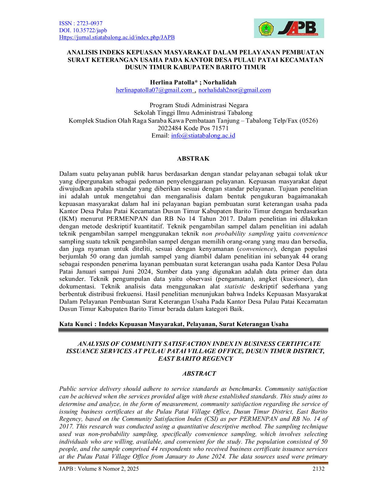 JAPBJAPBDalam suatu pelayanan publik harus berdasarkan dengan standar pelayanan sebagai tolak ukur yang dipergunakan sebagai pedoman penyelenggaraan pelayanan. Kepuasan masyarakat dapat diwujudkan apabila standar yang diberikan sesuai dengan standar pelayanan. Tujuan penelitian ini adalah untuk mengetahui dan menganalisis dalam bentuk pengukuran bagaimanakah kepuasan masyarakat dalam hal ini pelayanan bagian pembuatan surat keterangan usaha pada Kantor Desa Pulau Patai Kecamatan Dusun Timur Kabupaten Barito Timur dengan berdasarkan (IKM) menurut PERMENPAN dan RB No 14 Tahun 2017. Dalam penelitian ini dilakukan dengan metode deskriptif kuantitatif. Teknik pengambilan sampel dalam penelitian ini adalah teknik pengambilan sampel menggunakan teknik non probability sampling yaitu convenience sampling suatu teknik pengambilan sampel dengan memilih orang-orang yang mau dan bersedia, dan juga nyaman untuk diteliti, sesuai dengan kenyamanan (convenience), dengan populasi berjumlah 50 orang dan jumlah sampel yang diambil dalam penelitian ini sebanyak 44 orang sebagai responden penerima layanan pembuatan surat keterangan usaha pada Kantor Desa Pulau Patai Januari sampai Juni 2024, Sumber data yang digunakan adalah data primer dan data sekunder. Teknik pengumpulan data yaitu observasi (pengamatan), angket (kuesioner), dan dokumentasi. Teknik analisis data menggunakan alat statistic deskriptif sederhana yang berbentuk distribusi frekuensi. Hasil penelitian menunjukan bahwa Indeks Kepuasan Masyarakat Dalam Pelayanan Pembuatan Surat Keterangan Usaha Pada Kantor Desa Pulau Patai Kecamatan Dusun Timur Kabupaten Barito Timur berada dalam kategori Baik.