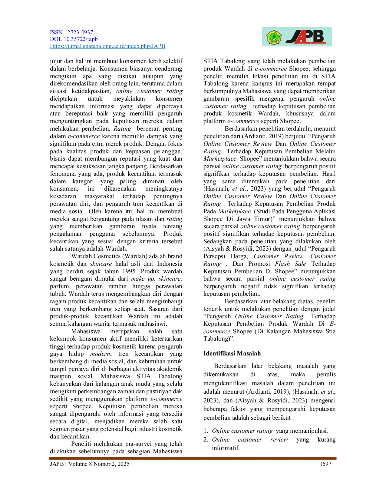JAPBJAPBPenelitian ini bertujuan untuk mengetahui dan menganalisis pengaruh online customer rating terhadap keputusan pembelian produk Wardah di e-commerce Shopee (di kalangan Mahasiswa STIA Tabalong), serta besar pengaruh online customer rating terhadap keputusan pembelian produk Wardah di e-commerce Shopee (di kalangan Mahasiswa STIA Tabalong). Penelitian ini menggunakan pendekatan kuantitatif, dengan metode field research (penelitian lapangan) dan jenis penelitian survei. Populasi berjumlah 537 orang, dan sampel berjumlah 84 orang. Teknik sampling dalam penelitian ini adalah Nonprobability Sampling, yaitu teknik purposive sampling. Hasil penelitian menunjukkan bahwa ada pengaruh online customer rating terhadap keputusan pembelian pada produk Wardah di e-commerce Shopee (dikalangan Mahasiswa STIA Tabalong), serta besarnya pengaruh yaitu sebesar 0,567 atau 56,7%, yang artinya ini termasuk dalam kategori tingkat hubungan sedang, sedangkan sisanya sebesar 43,3% dipengaruhi oleh variabel lain diluar variabel yang diteliti.