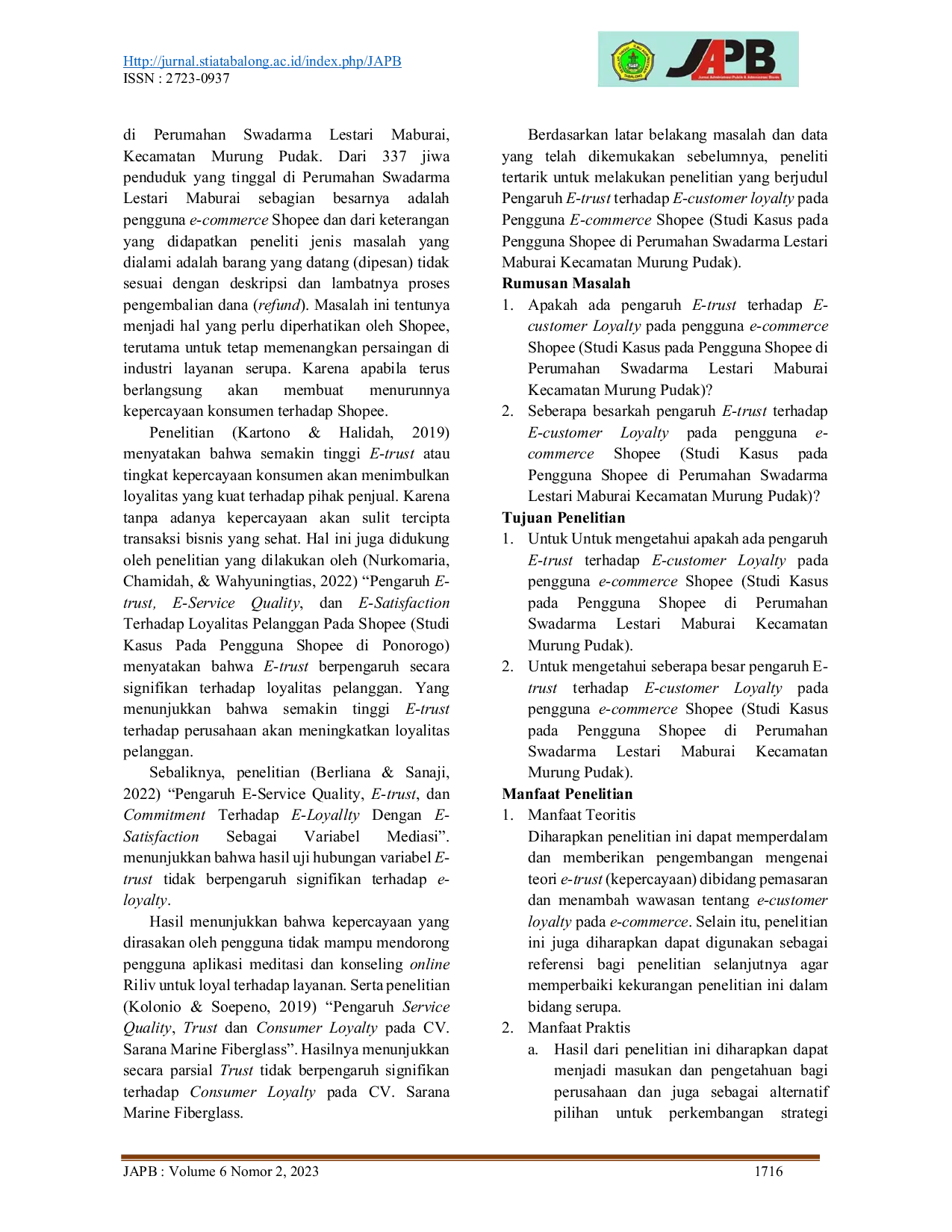 JAPBJAPBE-commerce merupakan suatu keadaan dimana proses jual beli produk dilakukan secara elektronik oleh konsumen serta dari perusahaan ke perusahaan dengan menggunakan komputer sebagai perantara dalam transaksi bisnis. Dalam konteks e-commerce, loyalitas disebut (e-customer loyalty) sebagai sikap pelanggan terhadap suatu situs online yang menghasilkan perilaku pembelian kembali. Tujuan penelitian ini adalah untuk mengetahui adakah pengaruh e-trust terhadap e-customer loyalty pada pengguna e-commerce Shopee di Perumahan Swadarma Lestari Maburai Kecamatan Murung Pudak, berapa besar pengaruh E-trust terhadap E-customer loyalty pada pengguna e-commerce Shopee di Perumahan Swadarma Lestari Maburai Kecamatan Murung Pudak.