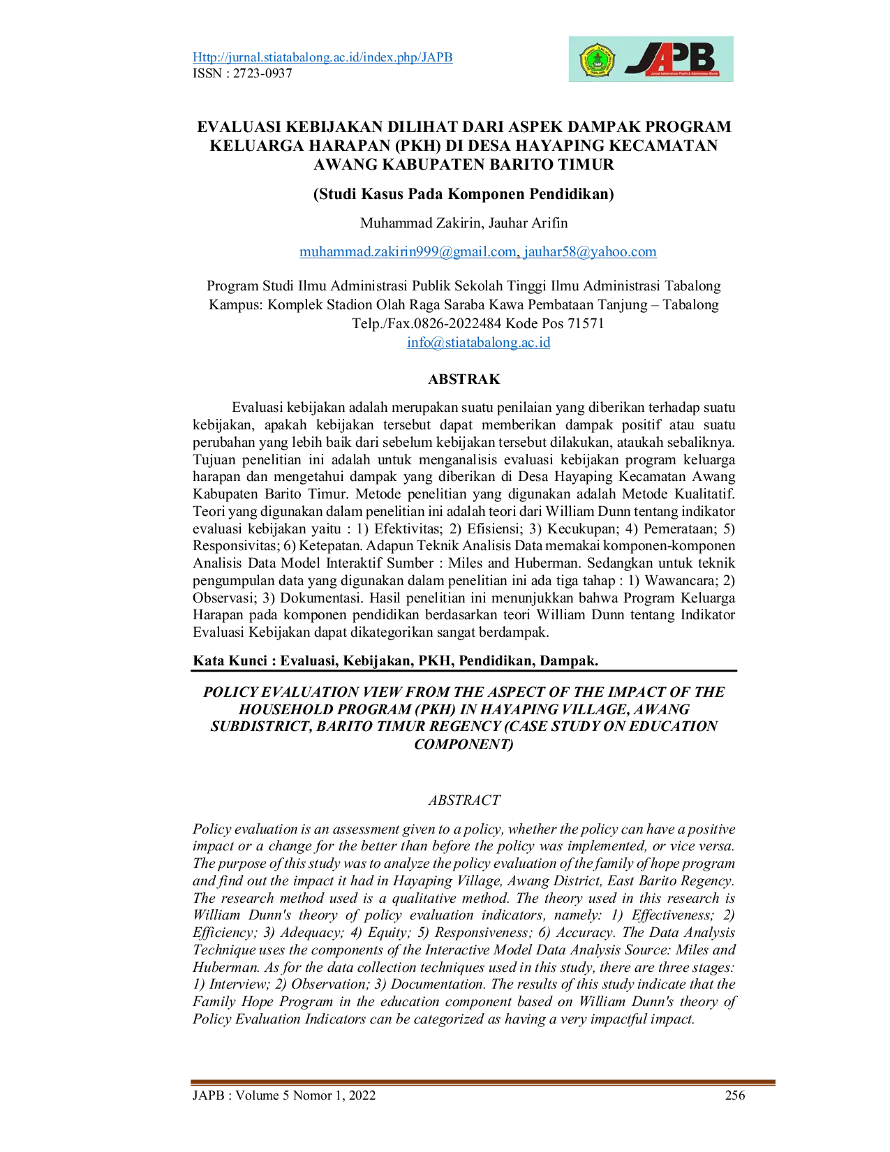 JAPBJAPBEvaluasi kebijakan adalah suatu penilaian terhadap suatu kebijakan, apakah kebijakan tersebut dapat memberikan dampak positif atau perubahan yang lebih baik dari sebelum kebijakan tersebut dilakukan. Tujuan penelitian ini adalah untuk menganalisis evaluasi kebijakan program keluarga harapan dan mengetahui dampak yang diberikan di Desa Hayaping Kecamatan Awang Kabupaten Barito Timur. Penelitian ini menggunakan metode kualitatif dan teori William Dunn tentang indikator evaluasi kebijakan. Hasil penelitian menunjukkan bahwa Program Keluarga Harapan pada komponen pendidikan berdasarkan teori William Dunn tentang Indikator Evaluasi Kebijakan dapat dikategorikan sangat berdampak.
