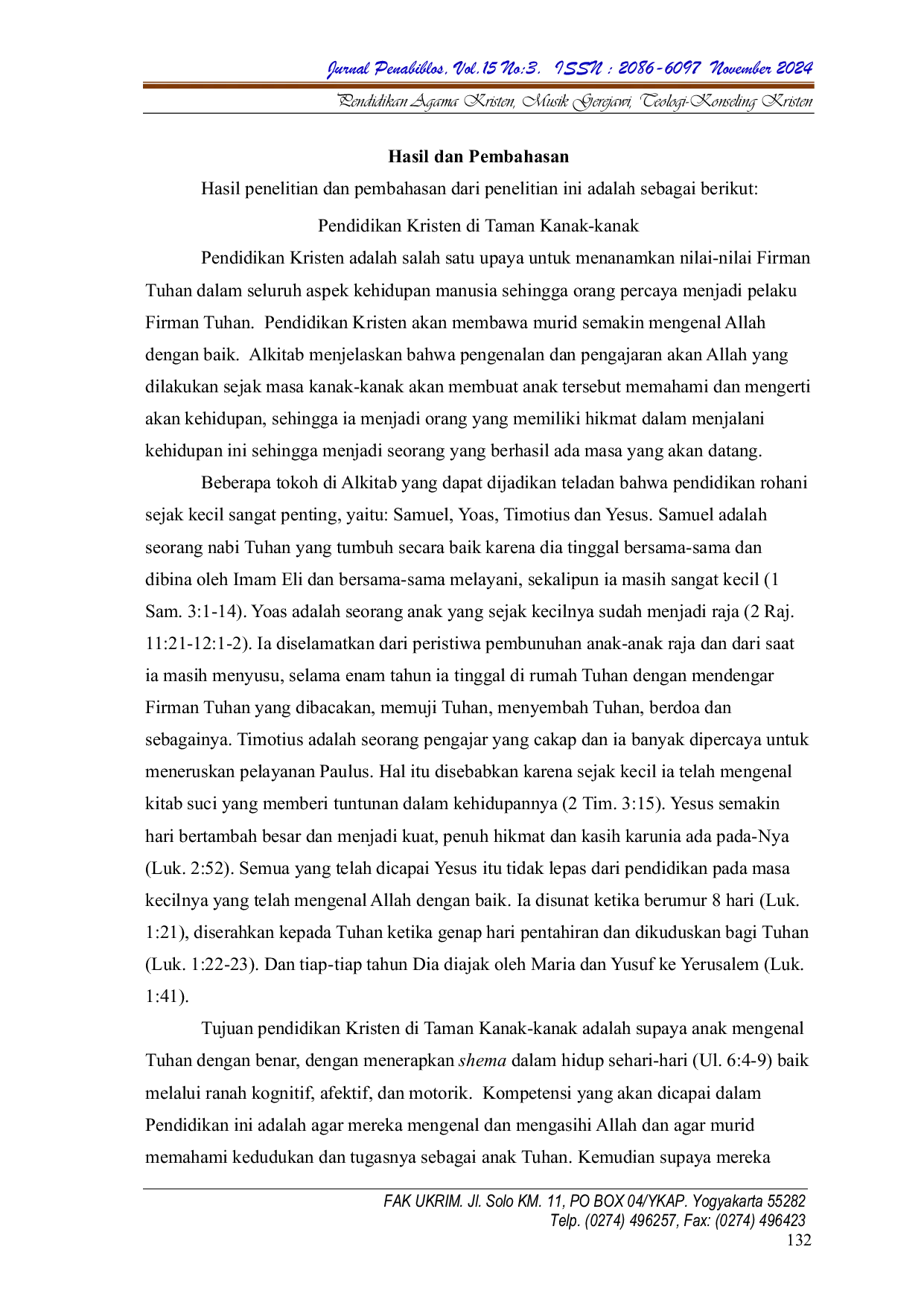 JURNAL PENABIBLOSJURNAL PENABIBLOSPendidikan Kristen di taman kanak-kanak sangat penting, karena anak-anak di usia ini merupakan bagian dari masa emas perkembangan manusia. Oleh karena itu, diperlukan metode pengajaran yang tepat agar pendidikan Kristen di taman kanak-kanak dapat berhasil. Metode Montessori dianggap sebagai metode yang efektif untuk pendidikan Kristen di taman kanak-kanak. Penelitian ini menggunakan pendekatan kualitatif dengan studi literatur mendalam untuk memahami metode Montessori. Selain itu, peneliti juga melakukan observasi di taman kanak-kanak untuk mengamati penerapan metode Montessori dalam pendidikan Kristen. Tujuan penelitian ini adalah untuk menjelaskan efektivitas metode Montessori dalam pendidikan Kristen di taman kanak-kanak.
