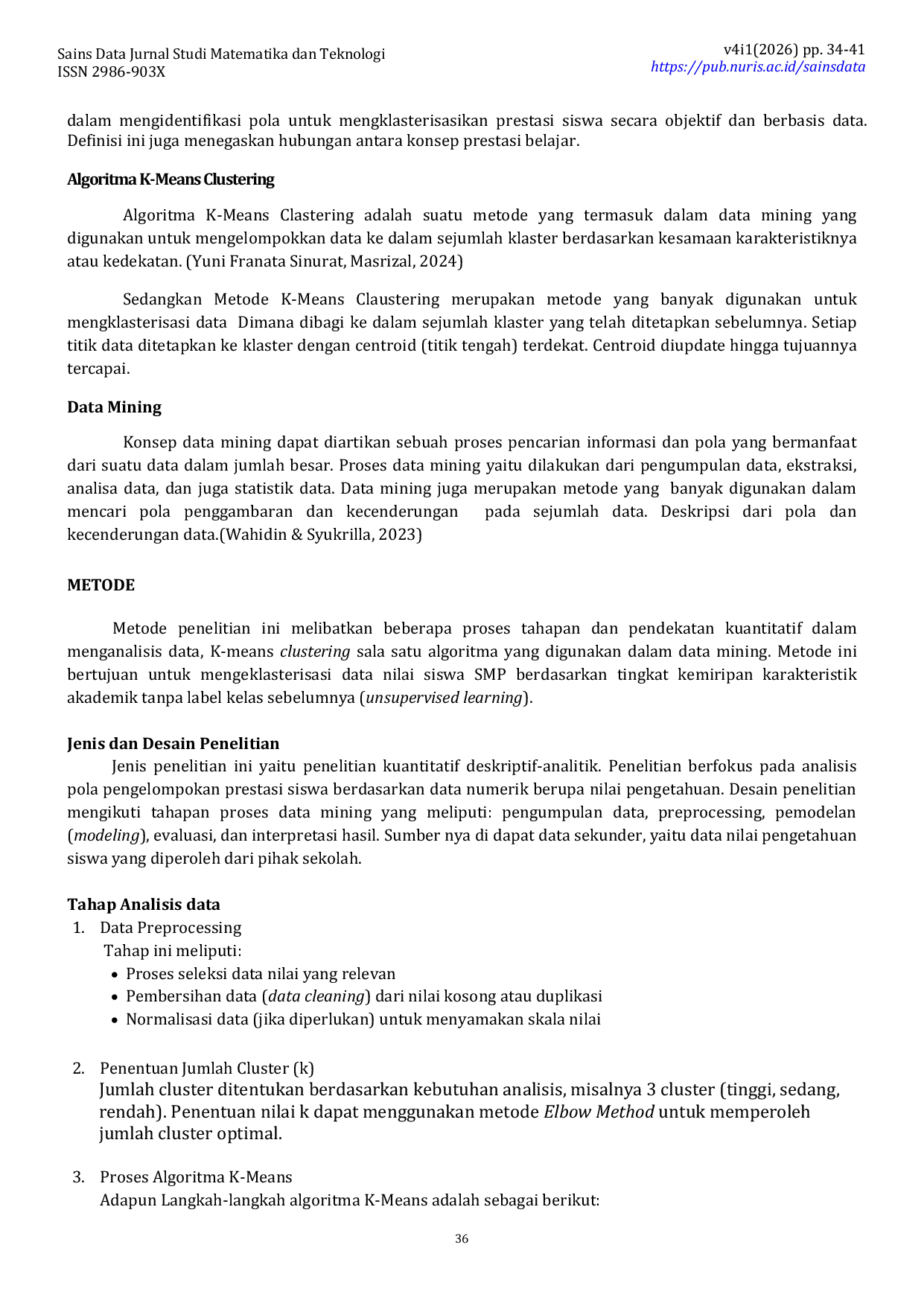 Sains Data Jurnal Studi Matematika dan TeknologiSains Data Jurnal Studi Matematika dan TeknologiPerkembangan teknologi memberikan dampak nyata hari ini. Khususnya dunia pendidikan dalam melakukan penilaian siswa, mengevaluasi keberhasilan proses pembelajaran di sekolah. Namun, pengelompokan prestasi berdasarkan nilai pengetahuan seringkali masih dilakukan secara manual sehingga kurang efektif dan kurang mampu memberikan gambaran pola akademik secara menyeluruh. Tujuan dari penelitian ini untuk menganalisis penerapan model algoritma K-Means clustering dalam mengelompokkan prestasi siswa berdasarkan nilai pengetahuan di SMP Negeri 2 Mekar Baru. Metode penelitian yang digunakan adalah pendekatan kuantitatif dengan teknik data mining. Data nilai pengetahuan siswa diolah melalui tahapan preprocessing, penentuan jumlah cluster (k), proses iterasi K-Means, serta mengevaluasi hasil pengelompokan. Hasil yang didapat menunjukkan bahwa algoritma K-Means mampu melakukan pengelompokan siswa ke dalam beberapa kategori prestasi, seperti tinggi, sedang maupun rendah, secara objektif berdasarkan kedekatan nilai centroid. Kesimpulannya, penerapan K-Means efektif membantu pihak sekolah dalam memetakan prestasi siswa sebagai dasar pengambilan keputusan adapun kebaruan dalam penelitian ini terletak pada penerapan model clustering sebagai sistem pendukung evaluasi prestasi berbasis data di tingkat SMP.