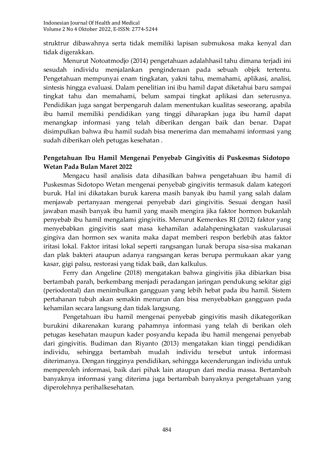 Indonesian Journal of Health and MedicalIndonesian Journal of Health and MedicalMasalah penelitian ini adalah tingginya persentase gingivitis ibu hamil pada kunjungan pertama di poli gigi di puskesmas sidotopo wetan kota Surabaya. Tujuan penelitian ini adalah untuk mengetahui kota Surabaya. Jenis penelitian ini adalah deskriptif yang dilakukan pada ibu hamil sebanyak 20 orang yang berkunjung ke ruang poli gigi dan mulut di puskesmas sidotopo wetan. Metode yang digunakan adalah dengan menggunakan pengisian lembar kuesioner. Analisa data yang digunakan adalah menghitung rata-rata dalam persen dan disajikan dalam bentuk tabel. Hasil penelitian didapatkan tingkat pengetahuan ibu hamil mengenai pengertian gingivitis termasuk dalam kategori cukup, tingkat pengetahuan ibu hamil mengenai penyebab gingivitis termasuk dalam kategori buruk, dan tingkat pengetahuan ibu hamil mengenai pencegahan gingivitis termasuk dalam kategori buruk.
