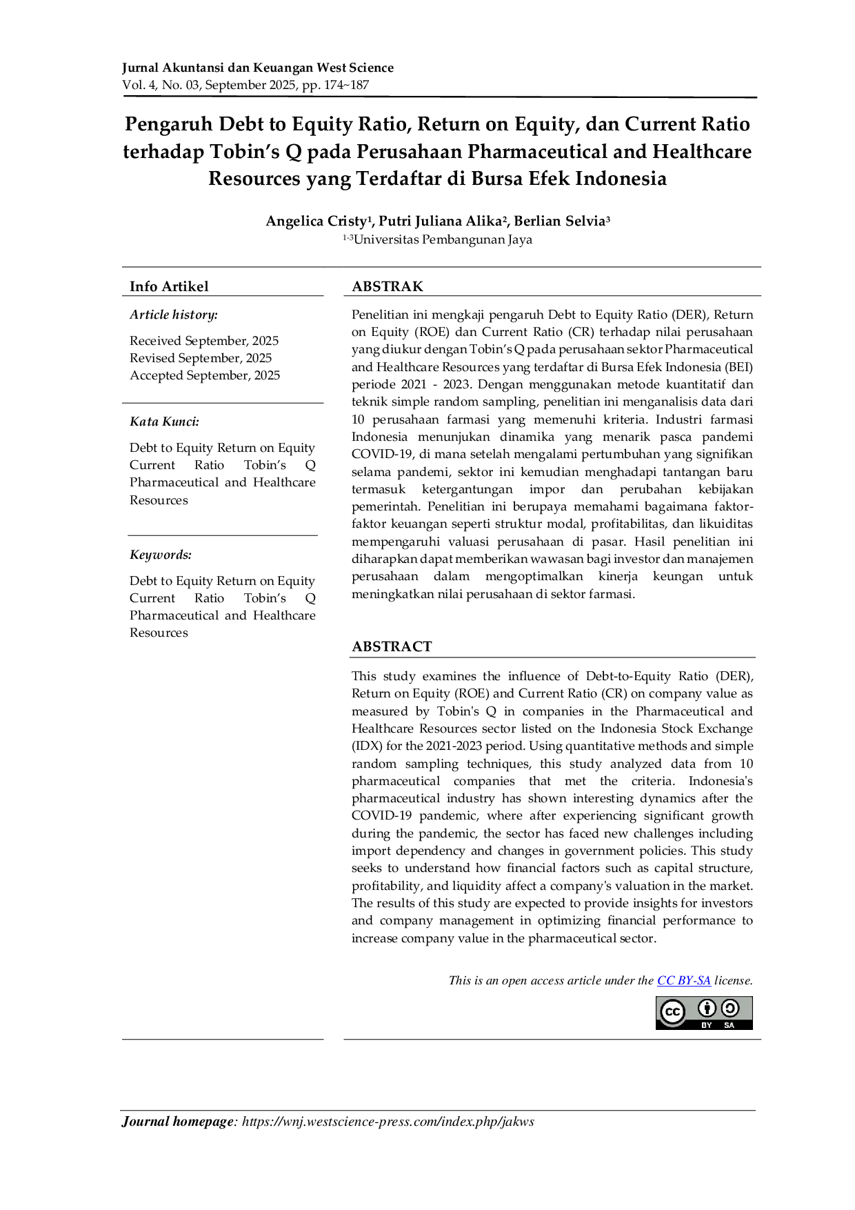 Jurnal Akuntansi Dan Keuangan West ScienceJurnal Akuntansi Dan Keuangan West SciencePenelitian ini mengkaji pengaruh Debt to Equity Ratio (DER), Return on Equity (ROE) dan Current Ratio (CR) terhadap nilai perusahaan yang diukur dengan Tobins Q pada perusahaan sektor Pharmaceutical and Healthcare Resources yang terdaftar di Bursa Efek Indonesia (BEI) periode 2021 - 2023. Dengan menggunakan metode kuantitatif dan teknik simple random sampling, penelitian ini menganalisis data dari 10 perusahaan farmasi yang memenuhi kriteria. Industri farmasi Indonesia menunjukan dinamika yang menarik pasca pandemi COVID-19, di mana setelah mengalami pertumbuhan yang signifikan selama pandemi, sektor ini kemudian menghadapi tantangan baru termasuk ketergantungan impor dan perubahan kebijakan pemerintah. Penelitian ini berupaya memahami bagaimana faktor-faktor keuangan seperti struktur modal, profitabilitas, dan likuiditas mempengaruhi valuasi perusahaan di pasar. Hasil penelitian ini diharapkan dapat memberikan wawasan bagi investor dan manajemen perusahaan dalam mengoptimalkan kinerja keungan untuk meningkatkan nilai perusahaan di sektor farmasi.