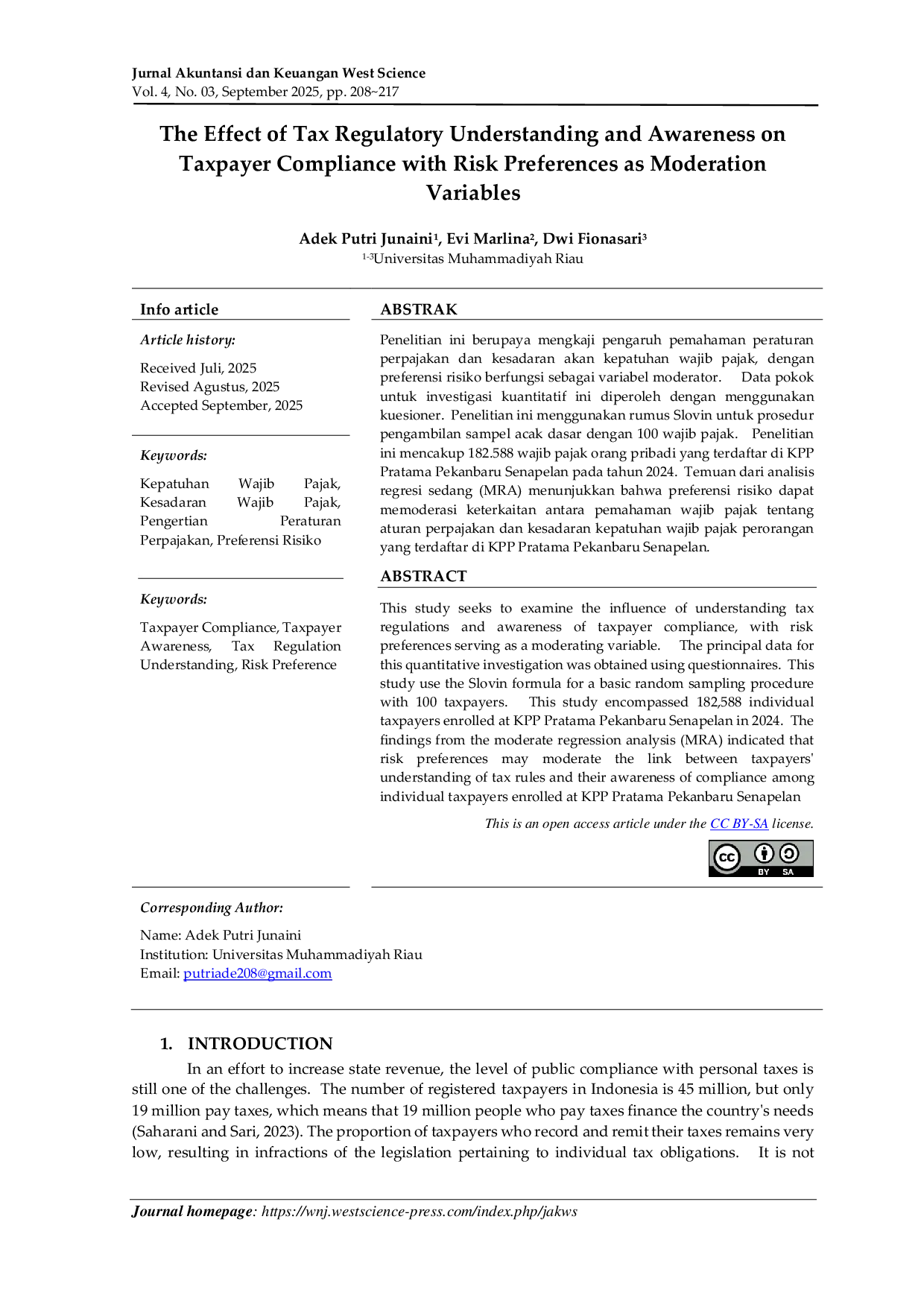 Jurnal Akuntansi Dan Keuangan West ScienceJurnal Akuntansi Dan Keuangan West SciencePenelitian ini berupaya mengkaji pengaruh pemahaman peraturan perpajakan dan kesadaran akan kepatuhan wajib pajak, dengan preferensi risiko berfungsi sebagai variabel moderator. Data pokok untuk investigasi kuantitatif ini diperoleh dengan menggunakan kuesioner. Penelitian ini menggunakan rumus Slovin untuk prosedur pengambilan sampel acak dasar dengan 100 wajib pajak. Penelitian ini mencakup 182.588 wajib pajak orang pribadi yang terdaftar di KPP Pratama Pekanbaru Senapelan pada tahun 2024. Temuan dari analisis regresi sedang (MRA) menunjukkan bahwa preferensi risiko dapat memoderasi keterkaitan antara pemahaman wajib pajak tentang aturan perpajakan dan kesadaran kepatuhan wajib pajak perorangan yang terdaftar di KPP Pratama Pekanbaru Senapelan.