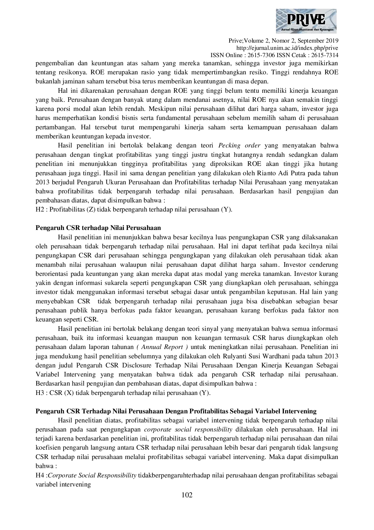 PRIVE: Jurnal Riset Akuntansi dan KeuanganPRIVE: Jurnal Riset Akuntansi dan KeuanganCorporate Social Responsibility (CSR) adalah kegiatan yang dilakukan oleh perusahaan sebagai tanggung jawab dari kegiatan operasionalnya. Hal ini juga dilakukan sebagai upaya dalam meningkatkan profitabilitas dan nilai perusahaan. Penelitian ini bertujuan untuk mengetahui pengaruh Corporate Social Responsibility terhadap nilai perusahaan dengan profitabilitas sebagai variabel intervening. Penelitian ini dilakukan dengan cara analisis regresi sederhana dan analisis jalur. Hasilnya Corporate Social Responsibility tidak berpengaruh terhadap nilai perusahaan melalui profitabilitas sebagai variabel intervening karena pengaruh langsung Corporate Social Responsibility terhadap nilai perusahaan sebesar 0,255 lebih besar dari pada nilai standardized coefficient beta dari pengaruh tidak langsung CSR terhadap nilai perusahaan melalui profitabilitas sebesar 0,0180.