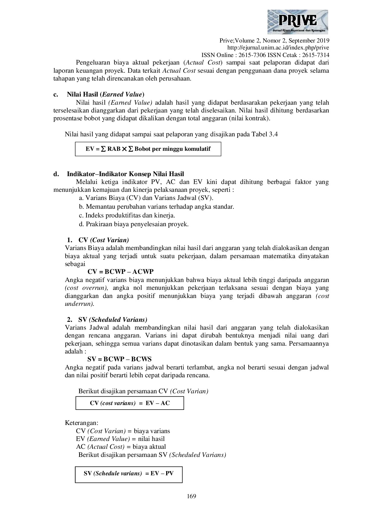 PRIVE: Jurnal Riset Akuntansi dan KeuanganPRIVE: Jurnal Riset Akuntansi dan KeuanganPengendalian merupakan salah satu fungsi dari manajemen proyek yang bertujuan agar pekerjaan-pekerjaan dapat berjalan mencapai sasaran tanpa banyak penyimpangan. Hubungan biaya langsung dan biaya tak langsung terhadap waktu memiliki kecenderungan bertolak belakang. Jika waktu pelaksanaan proyek dipercepat akan mengakibatkan peningkatan biaya langsung tetapi pada biaya tak langsung terjadi penurunan. Hasil analisis dengan menggunakan metode pengendalian biaya dan jadwal terpadu (earned value concept) pelaksanaan proyek Rehabilitasi Puskesmas Rawat Inap Pesanggrahan Kecamatan Kutorejo Kabupaten Mojokerto pada kinerja pelaksanaan proyek dari aspek biaya menunjukkan bahwa pelaksanaan proyek ini memperoleh keuntungan, hal ini ditunjukkan dari indikator CV (cost varian) bernilai positif Rp. 60.475.147 atau nilai indeks kinerja (CPI) = 1,07 > 1. Sedangkan dari aspek jadwal pelaksanaan proyek mengalami keterlambatan yang ditunjukkan oleh indicator SV (schedule varians) bernilai negatif Rp. -102.477.511 Atau indeks kinerja jadwal SPI = 0,90 < 1. Kinerja proyek pada saat pelaporan berjalan dengan baik, keuntungan akan di dapat karena dana yang dikeluarkan masih dibawah perencanaan anggaran yang dibuat. Nilai ETC positif sebesar Rp. 9.773.374. Sedangkan dari aspek jadwal, pelaksanaan mengalami sedikit keterlambatan dari jadwal yang ditetapkan, bisa dilihat dari EAS bulan Agustus 90 hari, sehingga EAS bulan September diatas 90 hari.