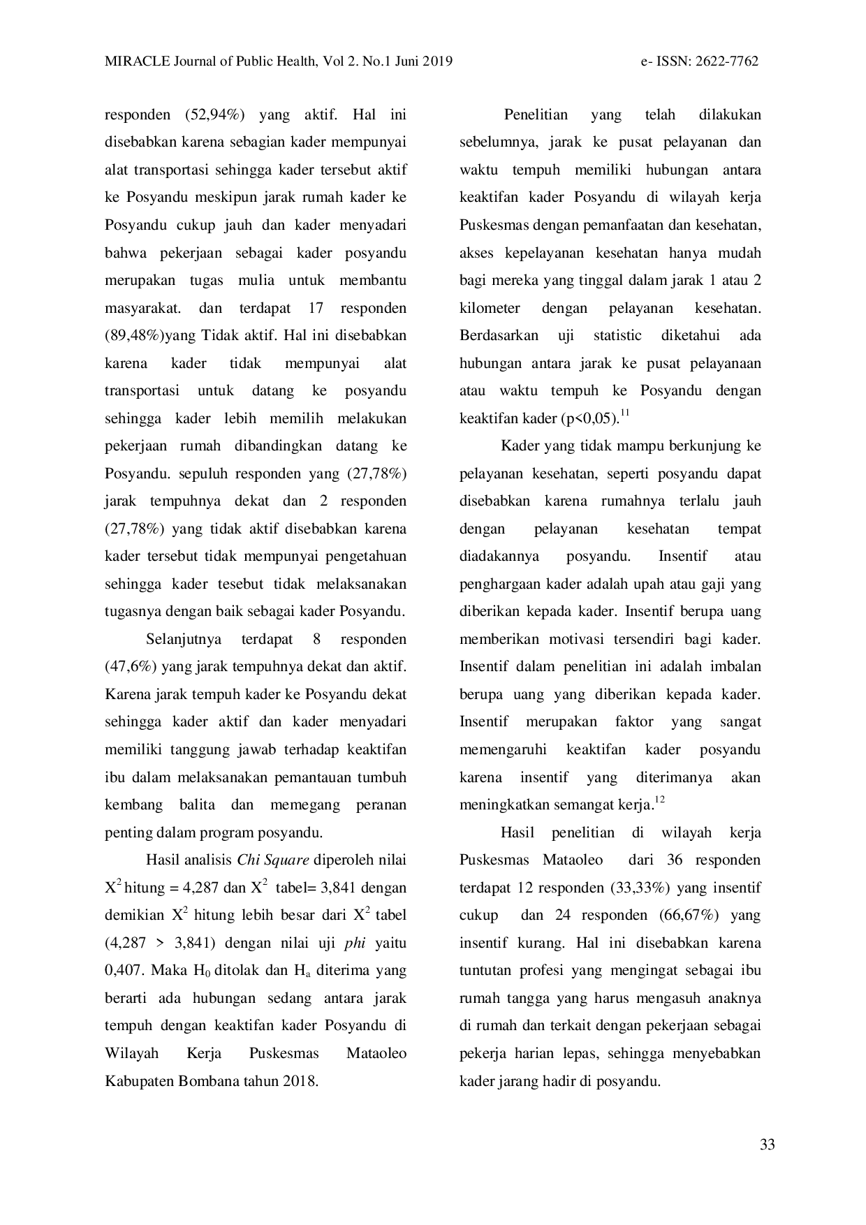 Miracle Journal of Public HealthMiracle Journal of Public HealthBerdasarkan observasi awal data pelaksanaan kegiatan pada data profil Puskesmas Mataoleo pada tahun 2017, Puskesmas Mataoleo memiliki 11 Posyandu yang terdiri dari Posyandu Pratama 4 (36,3%), Posyandu Madya 3 (27,2%), Purnama 2 (18,1%) dan Posyandu Mandiri 2 (18,1%) dengan jumlah kader Posyandu yaitu 57 orang. Jumlah kader yang aktif 23 orang (40,35%) dan jumlah kader yang tidak aktif 34 (59,64%) orang. Penelitian ini bertujuan untuk mengetahui faktor-faktor yang berhubungan dengan keaktifan kader Posyandu di wilayah kerja Puskesmas Mataoleo Kabupaten Bombana tahun 2018. Jenis penelitian adalah jenis penelitian kuantitatif dengan desain penelitian Cross Sectional Study. Populasi penelitian adalah 57 orang dengan tehnik penarikan sampel proporsional random sampling. Jumlah sampel sebanyak 36 orang. Analisis data menggunakan uji Chi-Square. Hasil penelitian diperoleh ada hubungan antara jarak tempuh dengan keaktifan kader posyandu dengan nilai X2 hit = 4,287, φ= 0,407. Ada hubungan antara insentif dengan keaktifan kader posyandu dengan nilai X2 hit = 4,026, φ= 0,393. Ada hubungan antara pelatihan dengan keaktifan kader posyandu dengan nilai X2 hit = 3,914, φ=0.387. Diharapkan kepada pihak yang terkait khususnya Puskesmas Mataoleo untuk meningkatkan Pelatihan kepada para kader Posyandu dan memberikan insentif yang sesuai, sehingga dapat memaksimalkan kinerja para kader Posyandu.