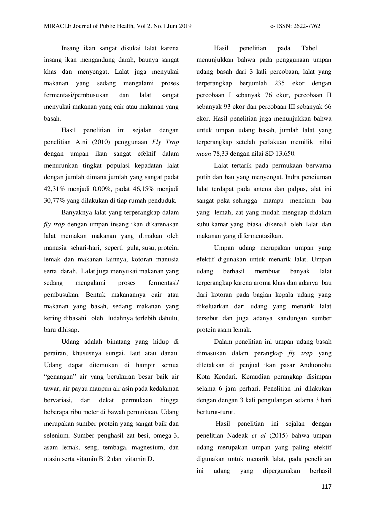 Umpan insang ikan paling efektif dalam menarik lalat dengan persentase keberhasilan 51,8%.Umpan udang basah juga efektif namun lebih rendah, yaitu 29,6%.Umpan tomat busuk merupakan yang paling rendah efektivitasnya, yaitu 18,6%.Terdapat perbedaan signifikan dalam efektivitas ketiga variasi umpan terhadap penggunaan perangkap lalat di Pasar Basah Anduonohu.