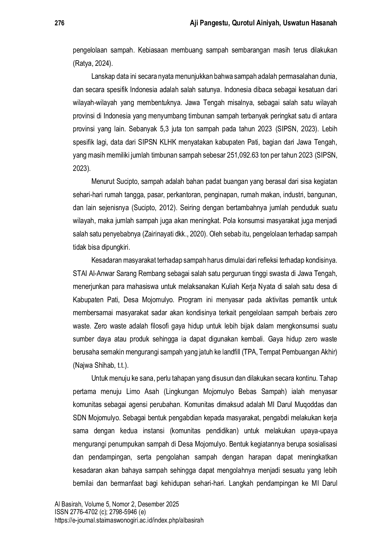 Jurnal Al BasirahJurnal Al BasirahProduksi sampah menjadi isu sentral karena dampaknya yang multidimensi menyebabkan krisis iklim dan lingkungan, penyebaran penyakit, juga banjir. Terutama pada kategori “sampah tak terkelola yang menjadi timbunan baik dari skala daerah maupun nasional. Oleh karena itu, inisiasi gerakan (movement) serta pengabdian ini secara spesifik bertujuan untuk melakukan pendampingan di Desa Mojomulyo menuju Lingkungan Mojomulyo Bebas Sampah (Limo Asah) sebagai pijakan awal pemulihan masalah sampah global. Pendekatan yang digunakan adalah Asset Based Community Development (ABCD) dengan lima tahapan: Discovery, Dream, Design, Define, dan Destiny. Hasil pengabdian adalah menginisiasi “Edu-waste Movement yang direpresentasikan dalam tiga program: (1) Penyuluhan Lingkungan Bersih bersama Dinas Lingkungan Hidup (DLH) Kabupaten Pati, (2) Pendampingan serta Penerapan Penggunaan Food Container dan Tumbler di Madrasah Ibtidaiah (MI) Darul Muqoddas, dan (3) Olah guna barang di Sekolah Dasar Negeri (SDN) Mojomulyo. Ketiganya berbasis pada komunitas pendidikan sebagai bentuk Edu-waste menuju Limo Asah.