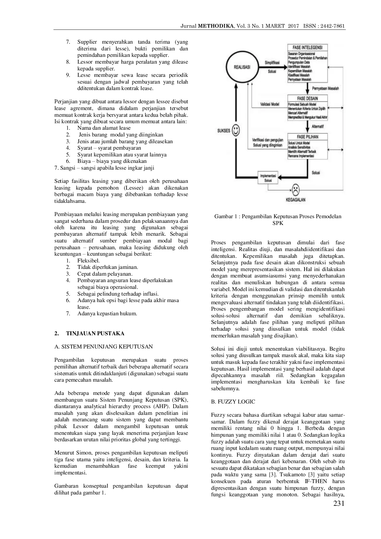 METHODIKA: Jurnal Teknik Informatika dan Sistem InformasiMETHODIKA: Jurnal Teknik Informatika dan Sistem InformasiPerusahaan Pembiayaan adalah badan usaha di luar Bank dan Lembaga Keuangan Bukan Bank yang khusus didirikan untuk melakukan kegiatan usaha: Sewa Guna Usaha, Anjak Piutang, Usaha Kartu Kredit dan atau Pembiayaan Konsumen. Skema bisnis perusahaan pembiayaan didasari oleh adanya underlying asset; dekatnya jaringan industri pembiayaan dengan industri manufaktur, distributor dan pemegang merek tunggal; serta mudah dan cepatnya pelayanan, membuat industri pembiayaan lebih dekat ke konsumennya dibandingkan industri pemberi kredit sejenis. Munculnya lembaga leasing merupakan alternatif yang menarik bagi para masyarakat, karena mereka dapat menggunakan sepeda motor langsung, tanpa mengeluarkan biaya besar untuk pembelian secara tunai. Cukup dengan mengeluarkan dana untuk uang muka atau Down Payment (DP), melalui leasing mereka bisa memperoleh dan untuk membiayai pembelian sepeda motor dengan jangka waktu antara 1 sampai 3 tahun. Pemanfaatan Sistem Penunjang Keputusan ini dapat membantu approval atau pejabat yang bersangkutan dalam melakukan putusan permohonan kredit dengan kemudahan dan waktu yang relatif cepat dan mengurangi resiko kredit berdasarkan bobot yang sudah ditentukan dengan menggunakan metode fuzzy. Metode penelitian menggunakan metode SDLC, dengan pemanfaatan metode fuzzy menggunakan variable penghasilan, pengeluaran serta variable angsuran, pada tahapan kesimpulan mendapatkan nilai angsuran yang layak pada setiap nasabah.