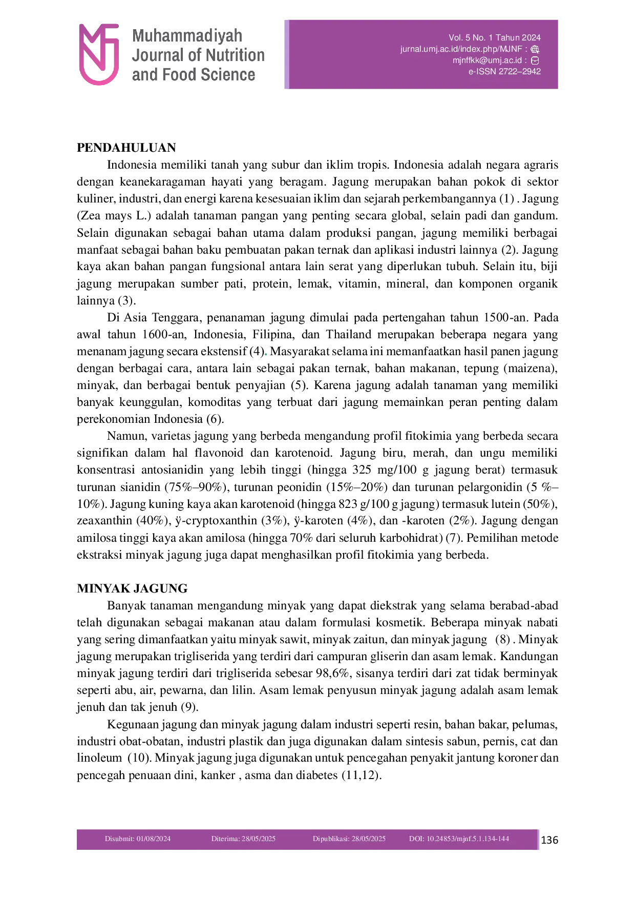 Muhammadiyah Journal of Nutrition and Food Science (MJNF)Muhammadiyah Journal of Nutrition and Food Science (MJNF)Salah satu minyak nabati yang paling terkenal di Indonesia dan banyak negara lainnya adalah minyak jagung. Minyak jagung telah lama dianggap sebagai pilihan utama di antara minyak nabati karena rasanya yang netral, stabilitasnya yang baik, dan manfaat kesehatannya. Dalam hal produksi tahunan, minyak jagung berada di urutan kesepuluh di antara semua minyak nabati dan menyumbang sekitar 2% dari total minyak nabati yang diproduksi di seluruh dunia. Minyak jagung didapatkan melalui proses ekstraksi bubuk biji jagung menggunakan teknik refluks dan sokhletasi dengan berbagai pelarut, termasuk n-heksana, etanol, dan etil asetat, untuk menghasilkan minyak jagung. Selanjutnya, dilakukan analisis kandungan fenolik dan karotenoid dalam minyak jagung. Hasilnya menunjukkan bahwa ekstraksi dengan metode sokhletasi menggunakan pelarut etil asetat menghasilkan kandungan fenolik dan karotenoid tertinggi, yaitu 149,28 ± 0,58bbmg/kg dan 76,42 ± 0,20b mg/g. Sementara itu, metode sokhletasi dengan pelarut N-heksana menghasilkan kandungan fenolik terendah dan metode maserasi dengan pelarut etanol menghasilkan kadar karotenoid terendah. Sehingga, metode sokhletasi dapat digunakan dalam industri produksi minyak jagung untuk menghasilkan minyak jagung dengan kadar fitokimia lebih tinggi.