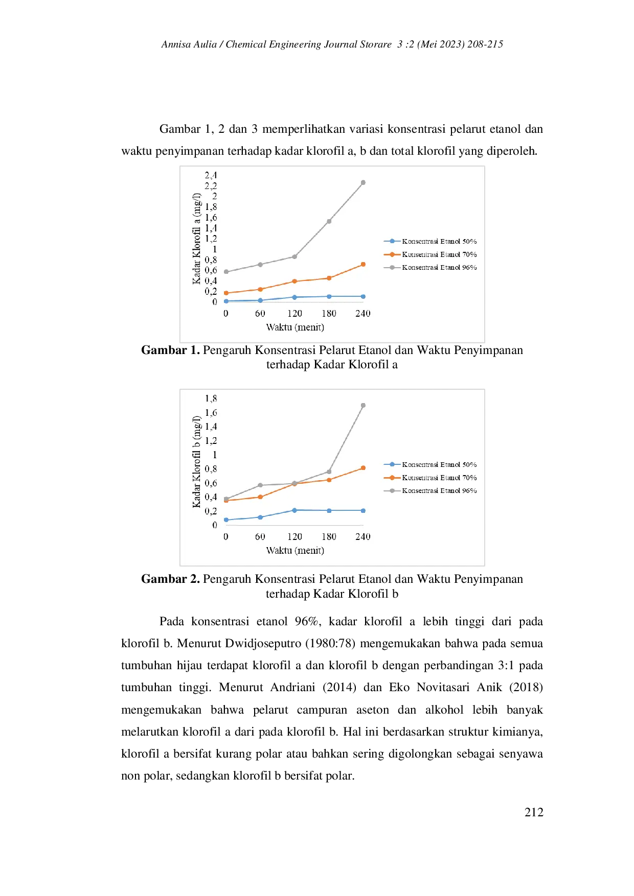 Hasil analisis menunjukkan bahwa kadar klorofil a dan b tertinggi diperoleh pada konsentrasi etanol 96%, dengan kadar klorofil a yang lebih tinggi dibandingkan klorofil b.Kadar klorofil tertinggi mencapai 3,9881 mg/l dan densitas sebesar 0,9430 gr/ml.Kondisi optimal ditemukan pada konsentrasi etanol 96% dan waktu penyimpanan selama 240 menit sebelum ekstraksi.