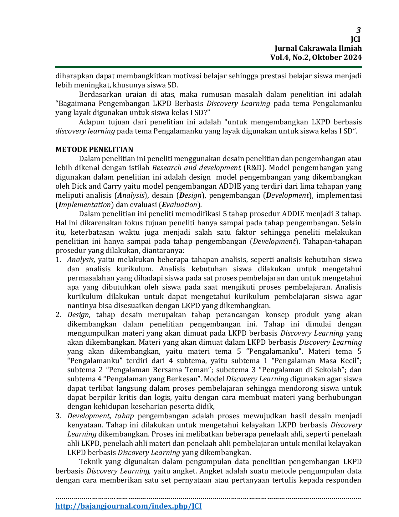 Jurnal Cakrawala IlmiahJurnal Cakrawala IlmiahPenelitian pengembangan ini bertujuan untuk mengembangkan produk lembar kerja siswa (LKPD) berbasis Discovery Learning dengan tema Pengalamanku yang sesuai untuk digunakan dalam proses pembelajaran. Penelitian ini merupakan jenis penelitian dan pengembangan (Research and Development) menggunakan model pengembangan ADDIE. Dalam penelitian ini, peneliti hanya melakukan tahapan pengembangan model ADDIE hingga tahap pengembangan. Instrumen yang digunakan untuk mengumpulkan data adalah kuesioner yang diberikan kepada beberapa validator ahli, yaitu validator ahli LKPD, validator ahli materi, dan validator ahli pembelajaran. Berdasarkan hasil validasi dari validator ahli LKPD, diperoleh skor 82 dengan kriteria Sangat Layak. Dari hasil validasi ahli materi, diperoleh skor 90 dengan kriteria Sangat Layak. Dari hasil validasi ahli pembelajaran, diperoleh skor 95 dengan kriteria Sangat Layak. Rata-rata skor dari hasil penilaian ketiga validator ahli memperoleh skor 89. Menurut kriteria penilaian, dapat dikatakan bahwa LKPD berbasis Discovery Learning Pengalamanku yang dikembangkan Sangat Layak untuk digunakan dalam proses pembelajaran.