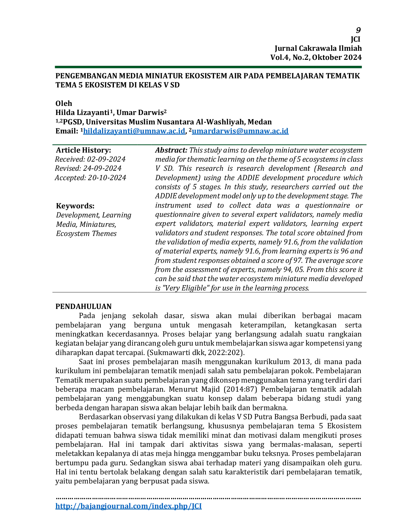 Jurnal Cakrawala IlmiahJurnal Cakrawala IlmiahPenelitian ini bertujuan untuk mengembangkan media miniatur ekosistem air untuk pembelajaran tematik tema 5 ekosistem di kelas V sekolah dasar. Penelitian ini merupakan penelitian pengembangan (Research and Development) yang menggunakan prosedur pengembangan ADDIE yang terdiri dari 5 tahap. Dalam penelitian ini, peneliti hanya melaksanakan model pengembangan ADDIE hingga tahap pengembangan. Instrumen yang digunakan untuk mengumpulkan data adalah angket atau kuesioner yang diberikan kepada beberapa validator ahli, yaitu validator ahli media, validator ahli materi, validator ahli pembelajaran, dan respon siswa. Skor total yang diperoleh dari validasi ahli media adalah 91,6, dari validasi ahli materi adalah 91,6, dari ahli pembelajaran adalah 96, dan dari respon siswa diperoleh skor 97. Rata-rata skor dari hasil penilaian para ahli adalah 94,05. Berdasarkan skor tersebut, dapat dinyatakan bahwa media miniatur ekosistem air yang dikembangkan sangat layak digunakan dalam proses pembelajaran.