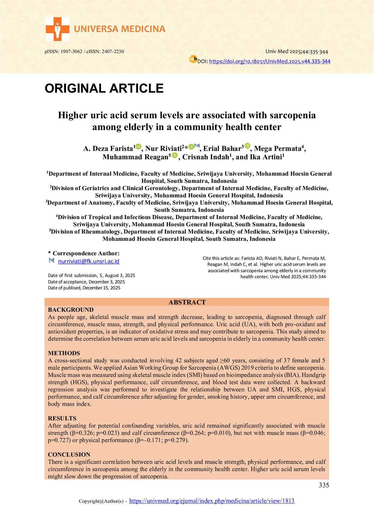 - Universa Medicina. higher uric acid serum levels associated sarcopenia elderly community health center... doi.org/10.18051/UnivMed.2025.v44.335-344Universa Medicina higher uric acid serum levels associated sarcopenia elderly community health center doi 10 18051 UnivMed 2025 v44 335 344