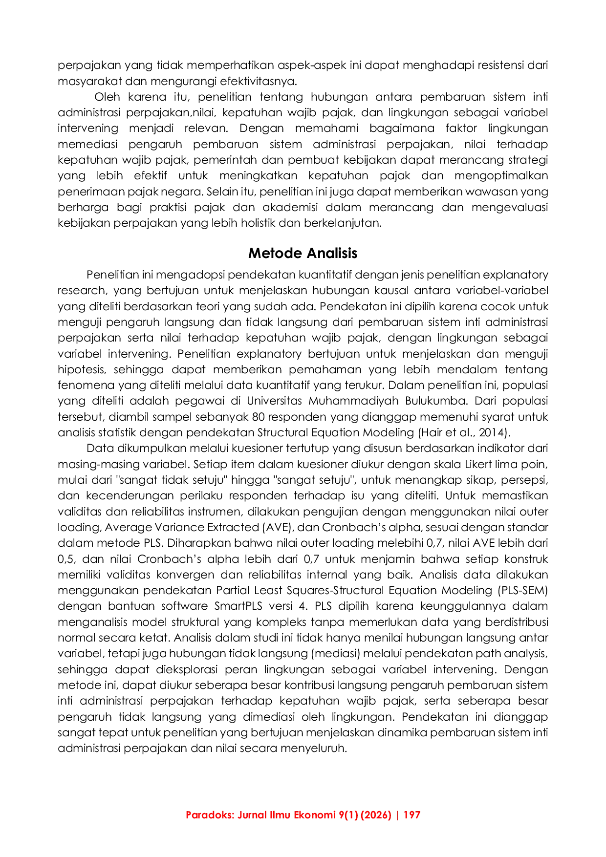 Paradoks : Jurnal Ilmu EkonomiParadoks : Jurnal Ilmu EkonomiPenelitian ini bertujuan untuk mengetahui bagaimana reformasi sistem administrasi perpajakan dapat meningkatkan kepatuhan wajib pajak dengan mempertimbangkan variabel lingkungan sebagai faktor intervening. Penelitian ini menggunakan pendekatan kuantitatif dengan jenis penelitian eksplanatori, yang bertujuan untuk menjelaskan hubungan sebab akibat antar variabel yang diteliti berdasarkan teori-teori yang ada. Dalam penelitian ini populasi yang diteliti adalah pegawai Universitas Muhammadiyah Bulukumba. Hasil penelitian adalah Indikator Pembaruan Sistem Administrasi Perpajakan menunjukkan kontribusi yang signifikan dalam meningkatkan pemahaman wajib pajak terhadap kewajiban perpajakan. Lingkungan sosial juga terbukti memiliki pengaruh penting terhadap kepatuhan wajib pajak, hal ini menunjukkan bahwa kebijakan perpajakan yang mendukung dapat mendorong wajib pajak untuk lebih patuh. Selain itu, pengaruh tidak langsung pembaharuan nilai dan sistem melalui lingkungan menegaskan pentingnya mempertimbangkan aspek sosial dalam meningkatkan kepatuhan.